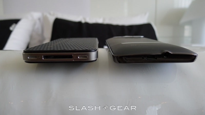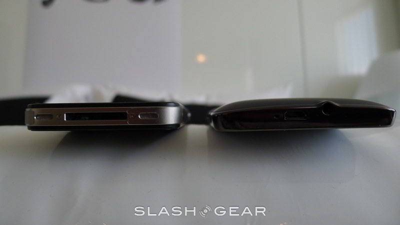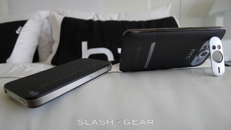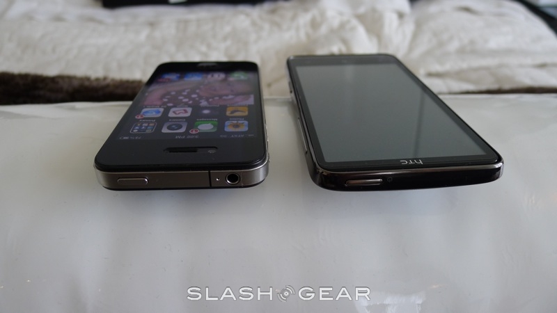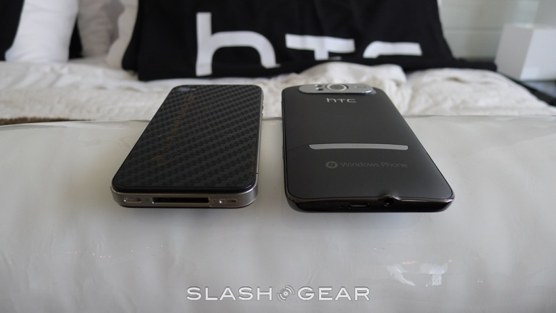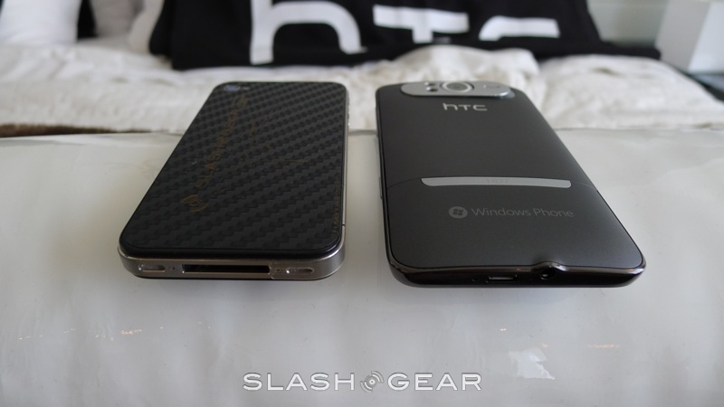 In your hand, the HD7 and iPhone 4 are both comfortable in their own right. However, the size of the HD7, and the fact that while the device may be almost as thin as the iPhone 4, there's a rounded back, may make it hard for some with smaller hands to hold the Windows Phone 7 smartphone comfortably. The flat-back of the iPhone 4 and its more "modest" size may make it more approachable to some. But, the HD7 does indeed come with a kickstand, which will make it easier for those watching a movie to enjoy it, by setting it down on a flat surface.