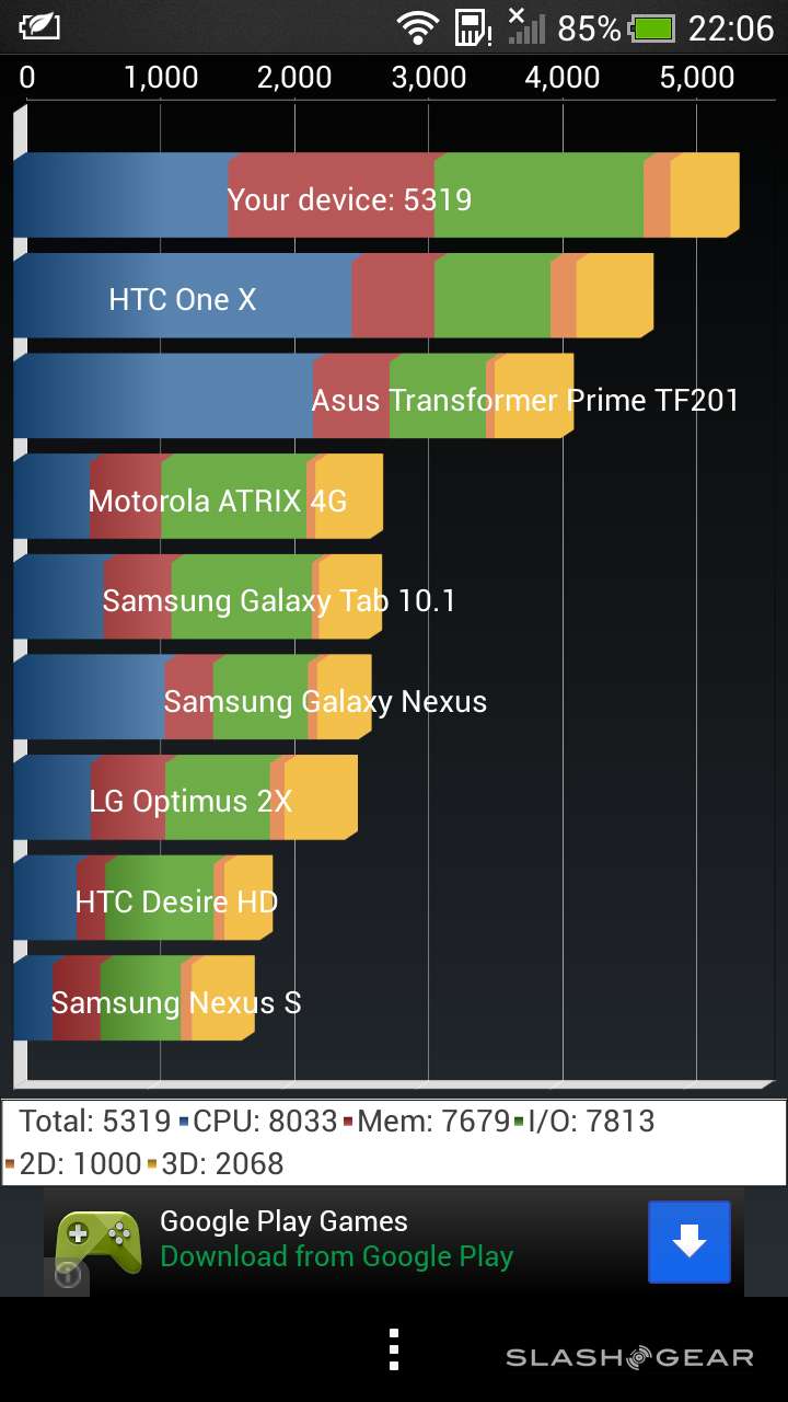 The HTC One mini works with a dual-core Qualcomm Snapdragon 400. This means it's not quite up to the task of taking on the HTC One's Snapdragon 600 with its four CPU cores, but here on a device with a smaller device with a smaller display with a lower resolution, the results appear the same. We've noticed no slowdown in everyday use, and we've not yet seen lag even when opening some of the most demanding games on the market. It would appear that we've reached a point in the smartphone chip-making world where the power has out-run the demand.