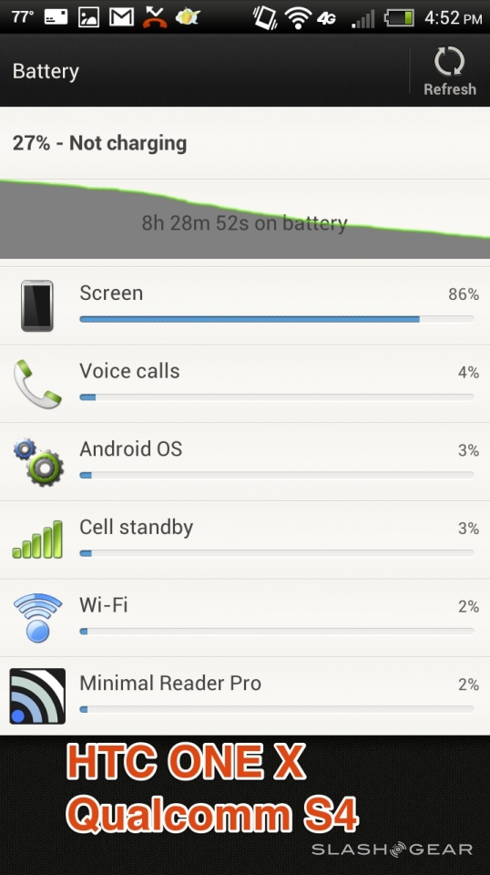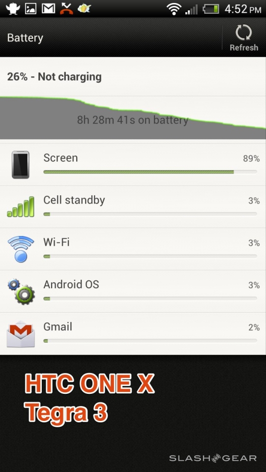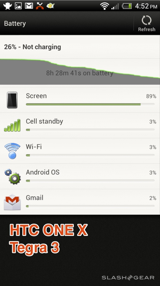 With the display set to be permanently on, along with GPS, and with mixed use of WiFi and cellular data, playing videos and browsing the internet, both versions of the One X managed to run for over eight hours with 26-percent power left. Bear in mind this is an extreme case: with more typical – though still heavy – use, we went for nearly a full day on a single charge.