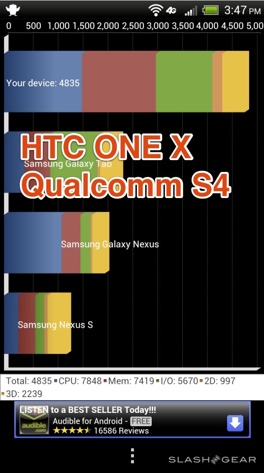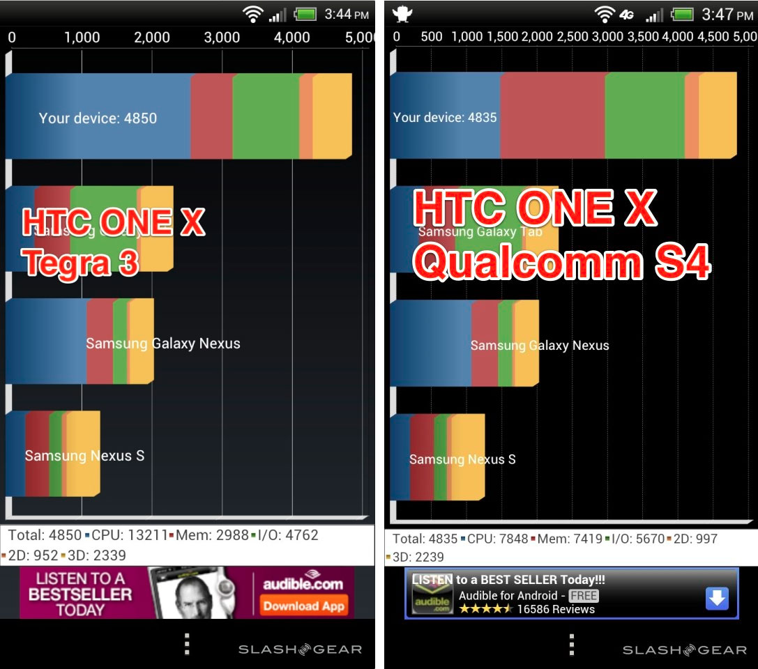 The impressive turn of speed the HTC One S delivered using Qualcomm's Snapdragon S4 tipped us to the fact that a dualcore wouldn't necessarily be behind compared to a quadcore, and so that AT&T's One X swaps the Tegra 3 for the S4 didn't give us too much cause for concern. In side-by-side testing, there's an obvious advantage for the NVIDIA but a less predicable bonus for the Snapdragon.