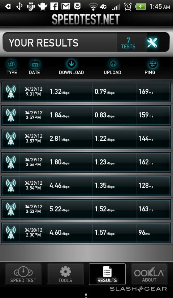 In our tests against the European model, which tops out at HSPA+, the AT&T model is roughly twice as fast. We've seen download peaks of up to 5.22 Mbps and upload peaks of 1.57 Mbps, while averages settled at 3.15 Mbps down and 1.22 Mbps up.