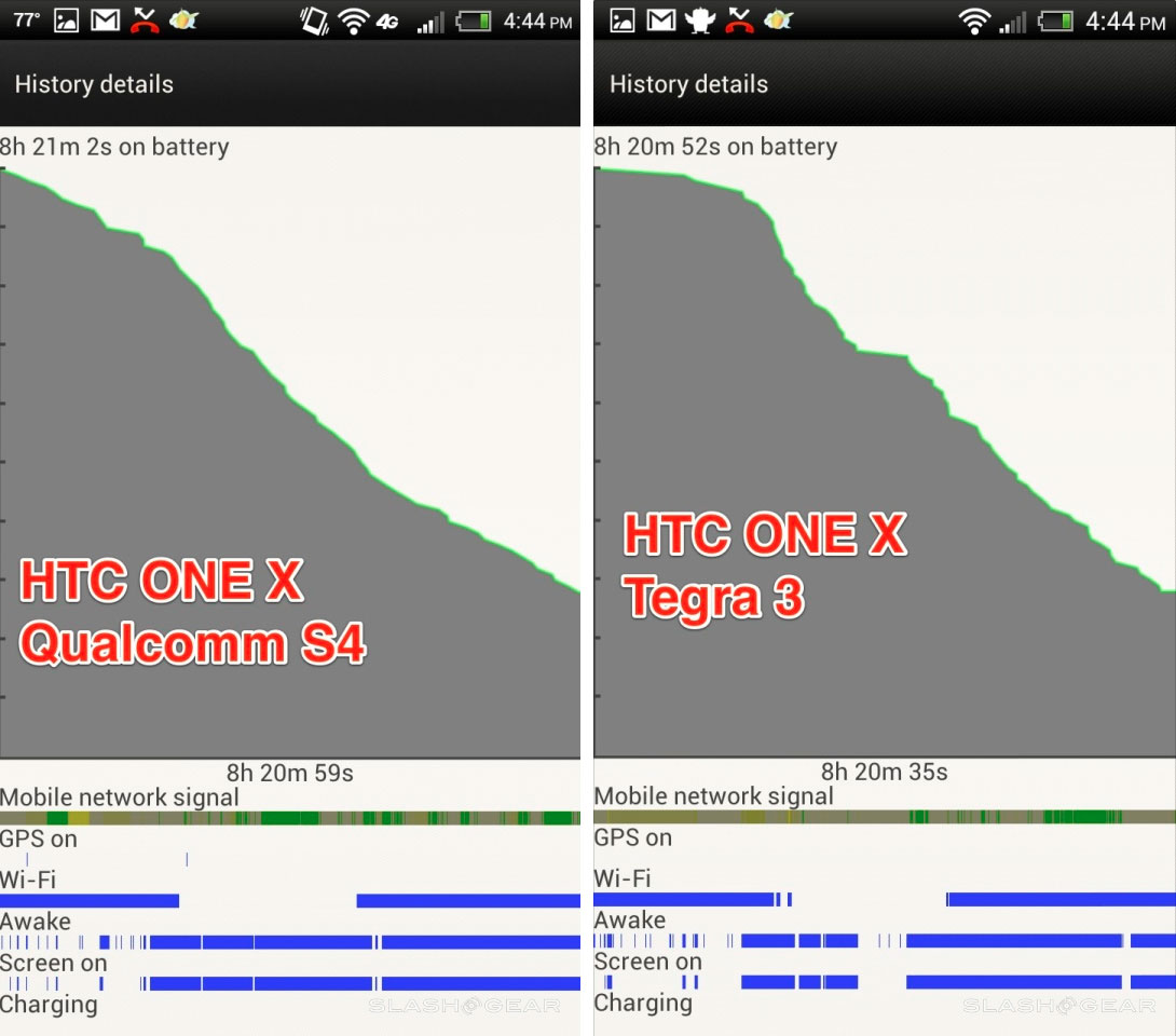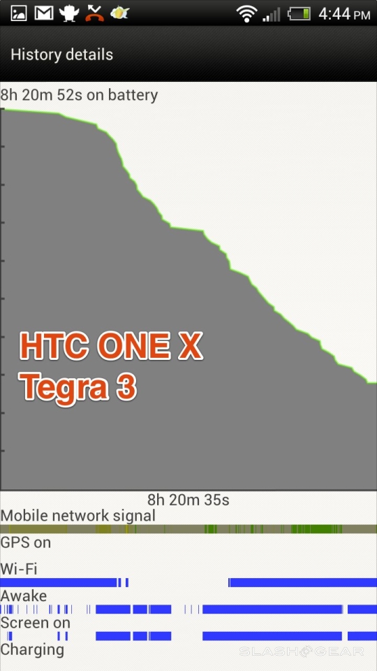 LTE has a tendency to consume battery in short order, though on the flip side there are fewer cores in the AT&T One X to power. Overall, then, runtimes for the Tegra 3 and S4 versions are roughly on a par, we found.