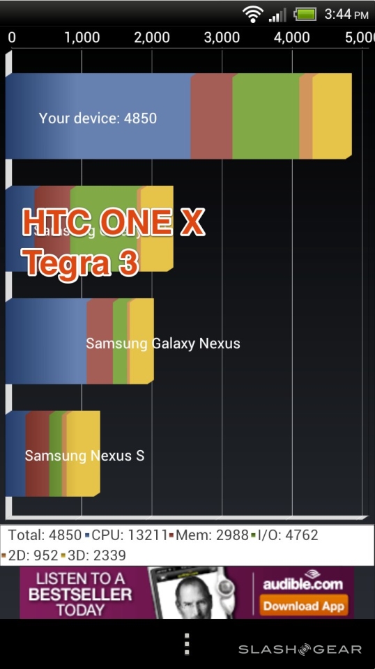 In Android benchmarking tool Quadrant Pro, the Tegra 3 One X scored 4850, slightly ahead of the Snapdragon S4 One X at 4835. What's interesting is the breakdown of those overall scores. The Tegra 3 model has significantly stronger CPU performance, unsurprisingly, almost double what the S4 can manage; however, the Snapdragon delivers roughly twice the memory I/O. That's in no small part down to its dual memory channels, and means data read/write is faster.