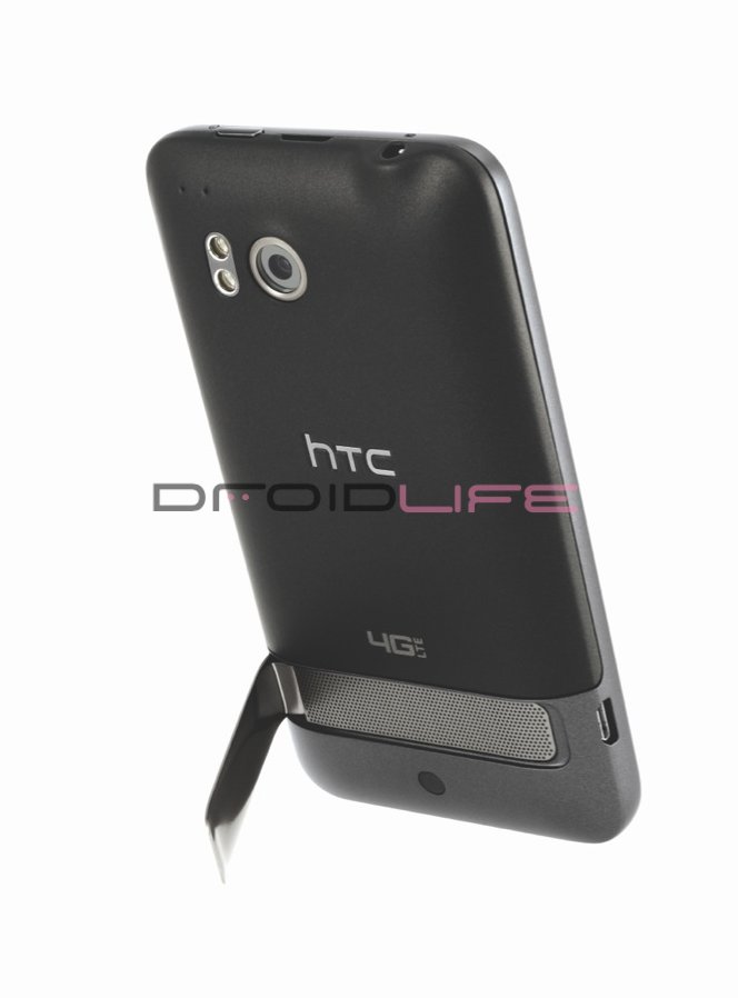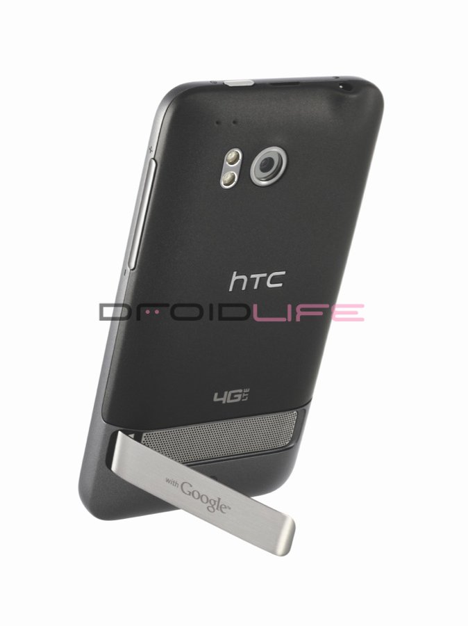 What we can see from the images, though, is that the Thunderbolt will have a bit of a secret behind the kickstand. Namely, a pretty large speaker. So, like the HD7 which launched not too long ago, will the Thunderbolt have a main drive towards media, and playing it back on your handset? We know that HTC will be showing off the handset at CES 2011, and with that "with Google" logo right on the kickstand, we're hoping to see that there won't be any Bing-specific application on this device.