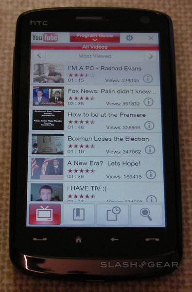 Select a clip and the screen automatically rotates to landscape and it begins downloading. Alternatively, hit "i" and there's an overview page, with text summary, upload details and star rating. While there's no way to rate the video on the Touch HD itself (in fact you can't log into your YouTube account at all) you can add them to the handset's bookmarks, add the channel to your program guide, or send the link by email, MMS or SMS message. The info page also shows thumbnails of three related videos and three further videos from the same channel.
