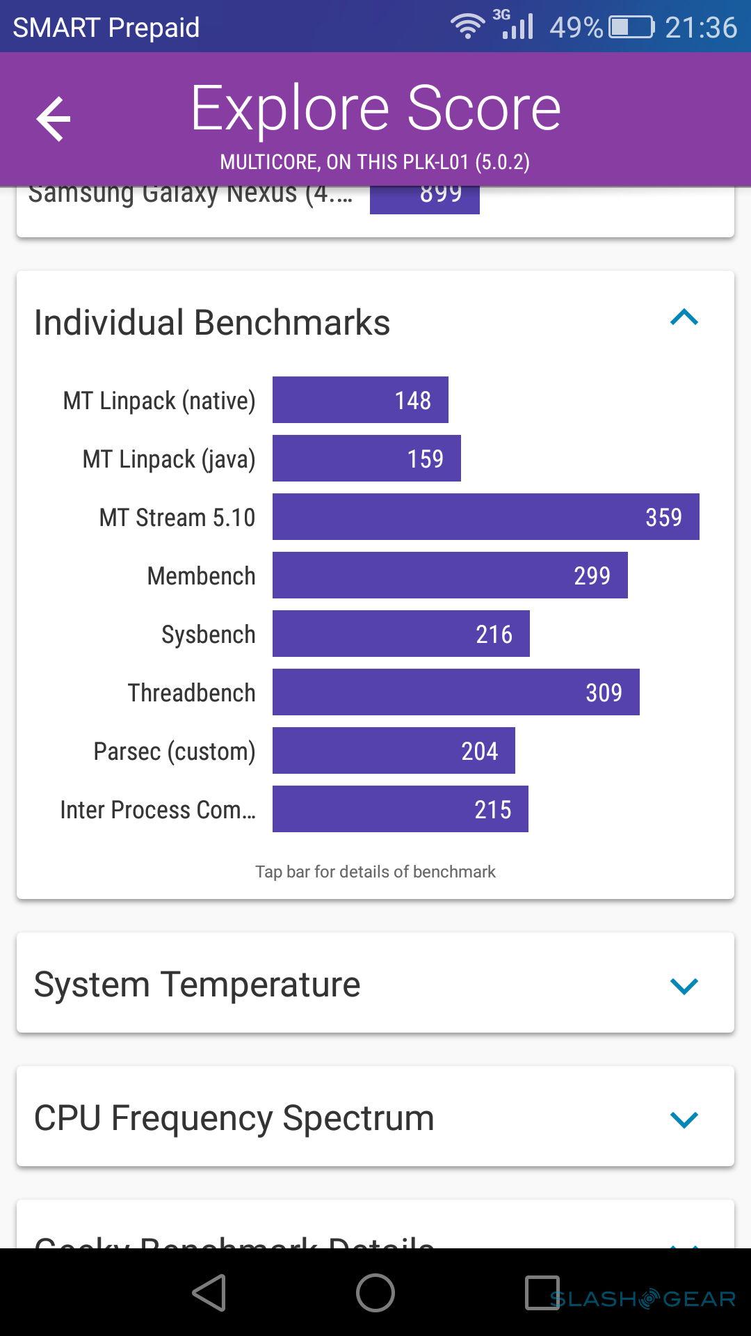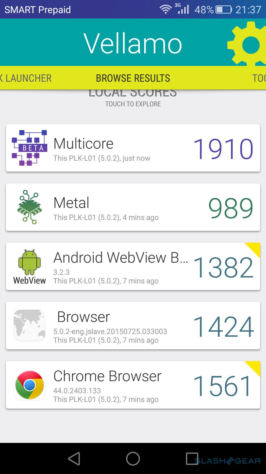 Vellamo is a Qualcomm benchmarking tool, so let's see how a non-Qualcomm bearing device fares: maybe unsurprisingly, quite poorly in all except one. This time, Vellamo has within its database more recent devices. Considering how the Honor 7 ranked low against last year's models, it's not surprising to see it pushed further back down when the new kids on the block are added. The one ray of sunshine on Huawei's flagship is the multi-core test. Like in AnTuTu and GeekBench, the Kirin 935 seems to shine brightest when its 8 cores are put to task, versus a simple single process task. It isn't surprising, then, to see how well the Honor 7 handles multi-tasking.