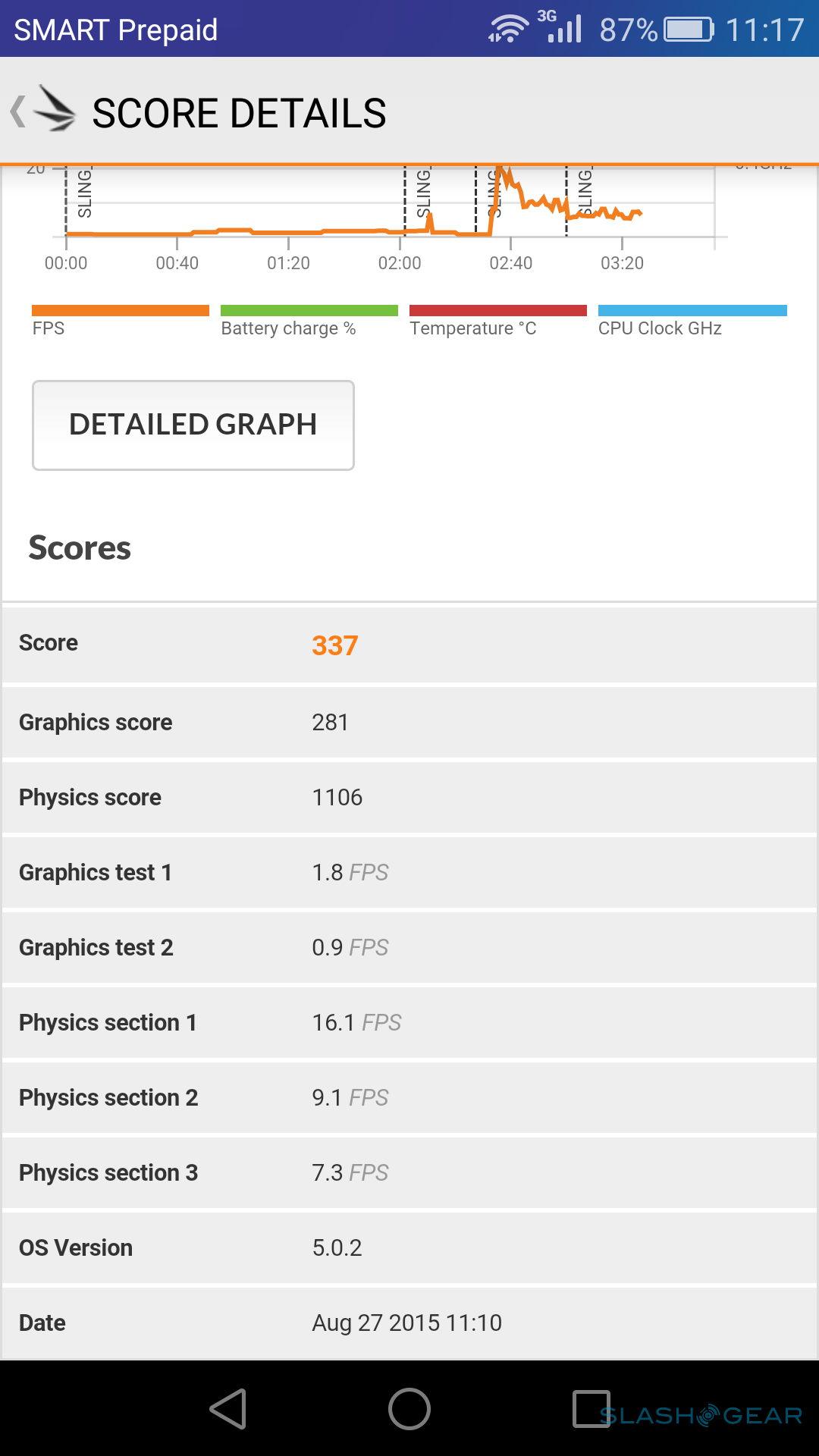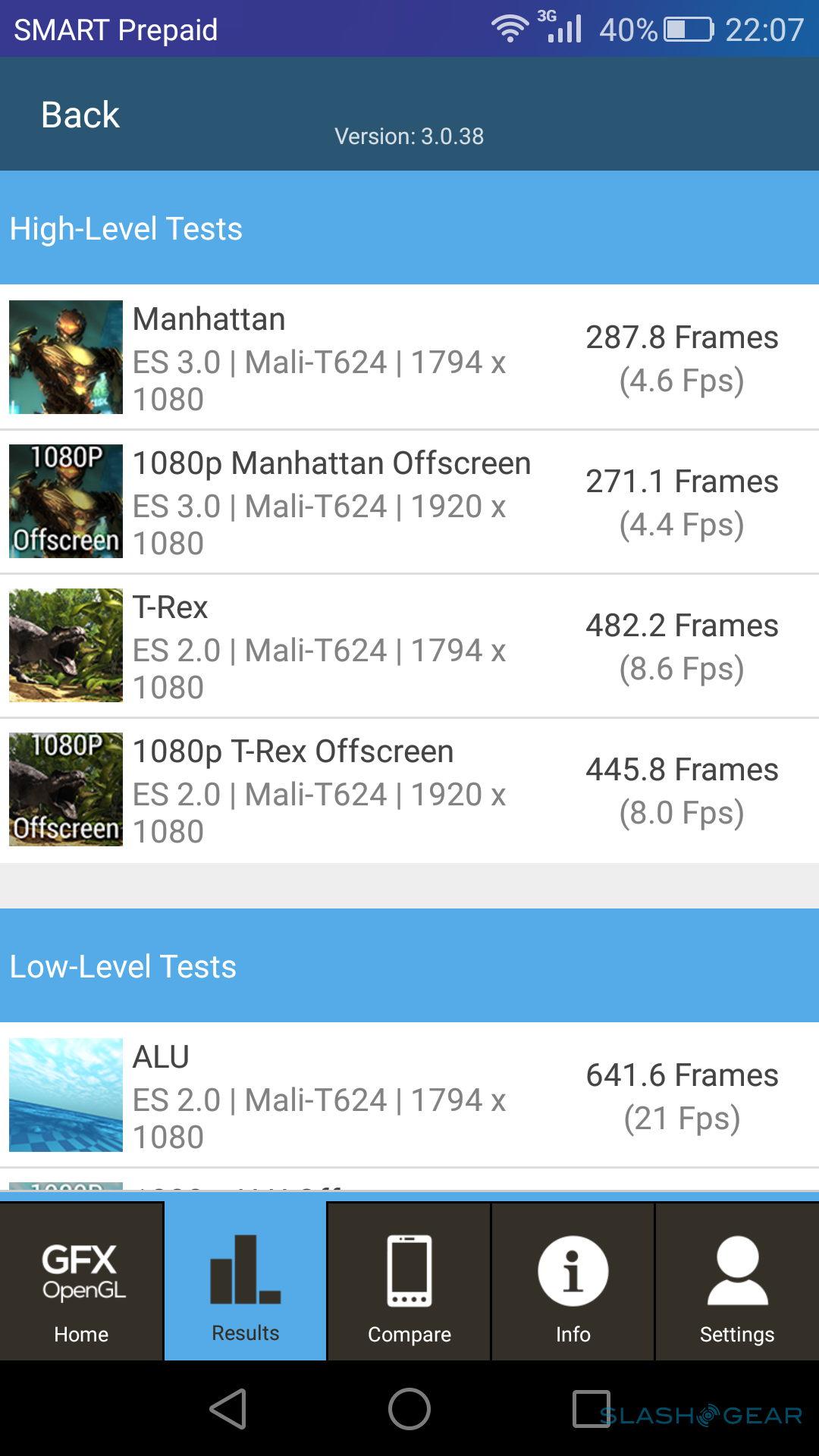 In fact, if numbers are to be believed, the Honor 7's GPU does terribly in comparison with any device from the last 1-2 years, including some brands you might not have expected (like ZTE's). Dozens of smartphones have scores in four digits while the Honor 7 is left with only three. That said, observing the graphics stress test, you would presume that it would actually do well in practice, which will also see later.