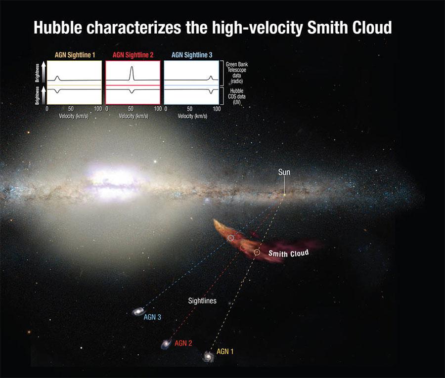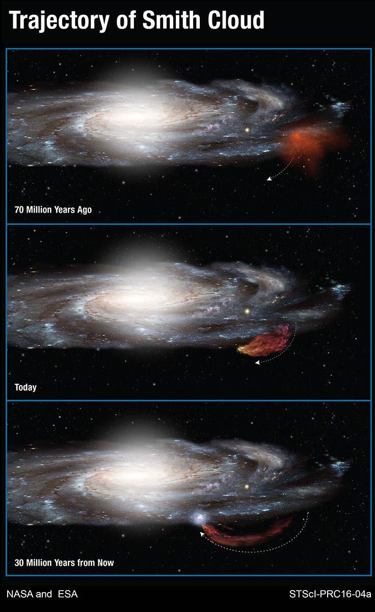 Astronomers using the Hubble Space telescope have viewed the Smith Cloud, a high velocity could of hydrogen gas. The Smith Cloud is a massive cloud of gas that is outside of the Milky Way galaxy and is traveling at 700,000 mph. The most unique aspect of the Smith Cloud is that its trajectory is well known.