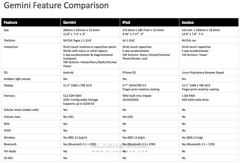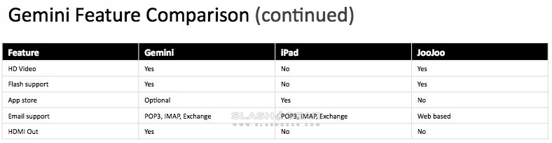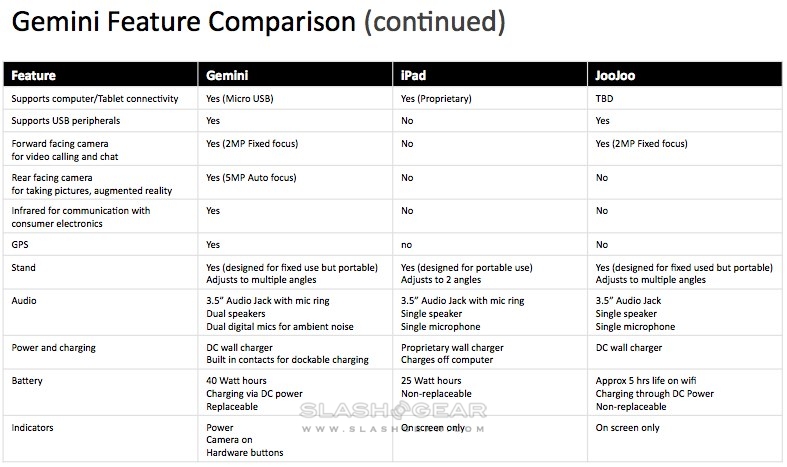 As well as their basic specs, ICD couldn't help but run some comparisons against what Apple's iPad and the Fusion Garage JooJoo bring to the table; you can see the charts in the gallery below. Unfortunately, while the two rival slates are shipping now, the Gemini's launch date and pricing are still a mystery.