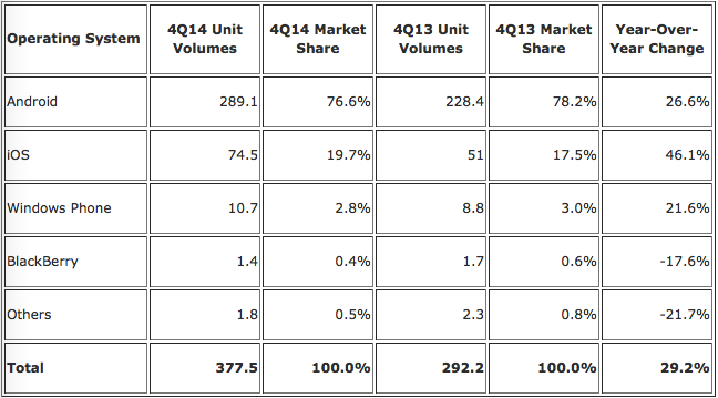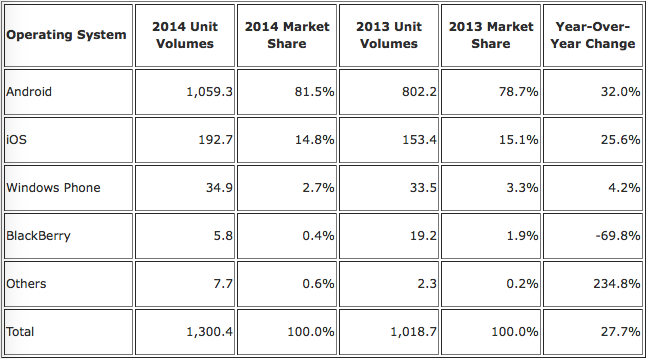 Android pushed past the one billion unit mark in 2014, a significant milestone by itself but also because total Android volumes in 2014 bested total smartphone volumes in 2013.