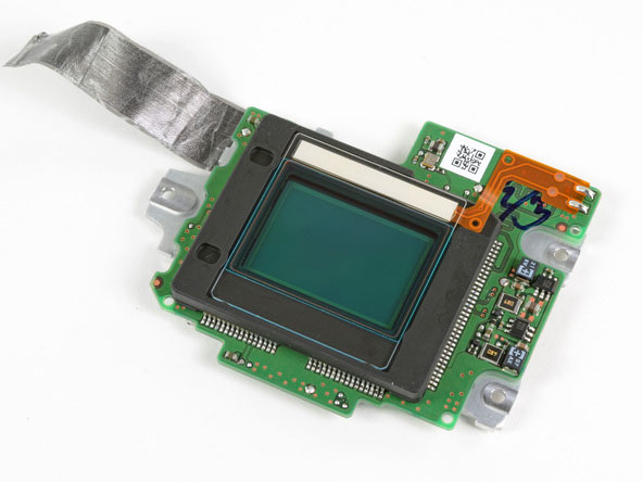The circuit board with the Exspeed chip and lots of other stuff is one of the first things that comes out of the camera. After the front panel is off you can see some of the workings for the shutter and other features of the camera. It all looks very tightly packaged. I particularly like the image of the sensor the camera uses all laid out for perusal.