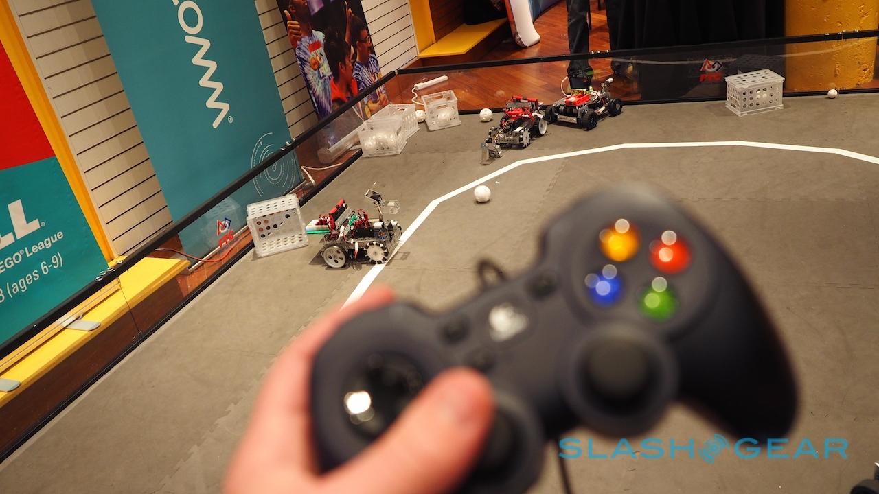 My own awkward trundling around the game field was soon overshadowed as the FTC players took turns. Importantly, the gamepads are the same as they're using currently, so after they figured out which button was mapped to which robotic limb, they quickly began running rings around me.