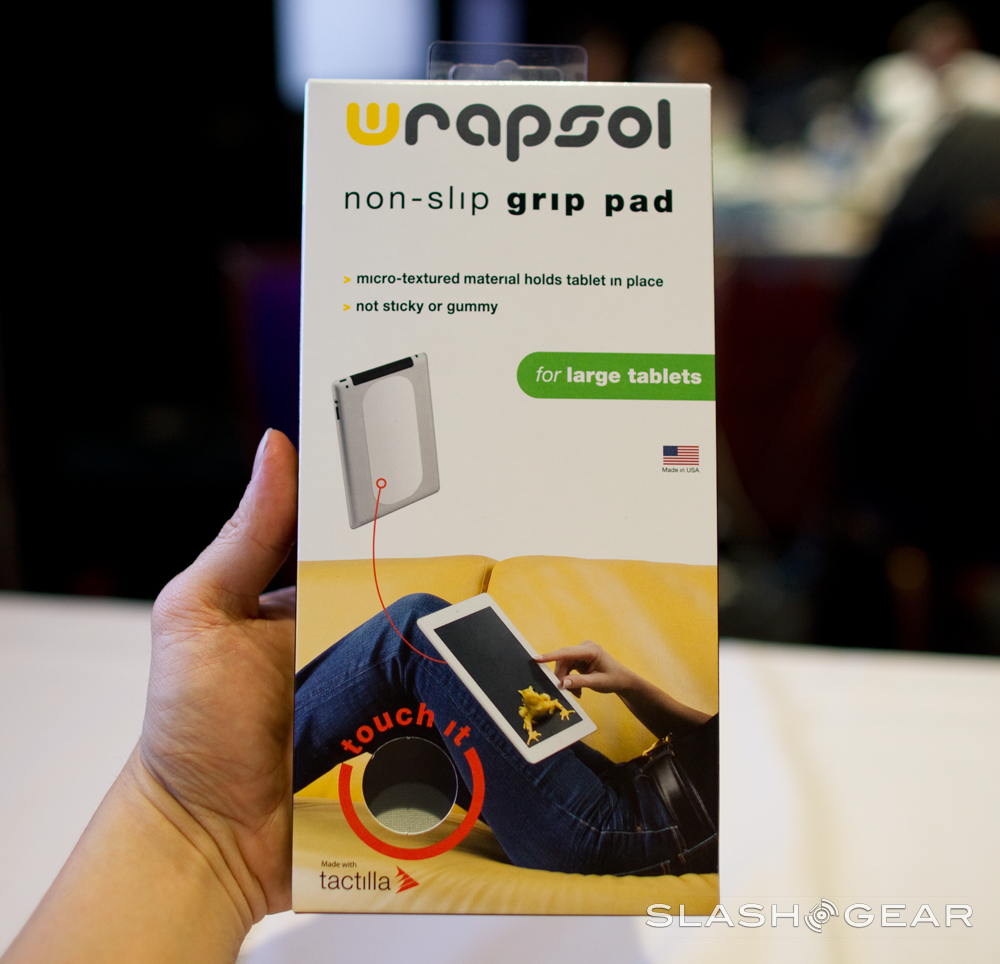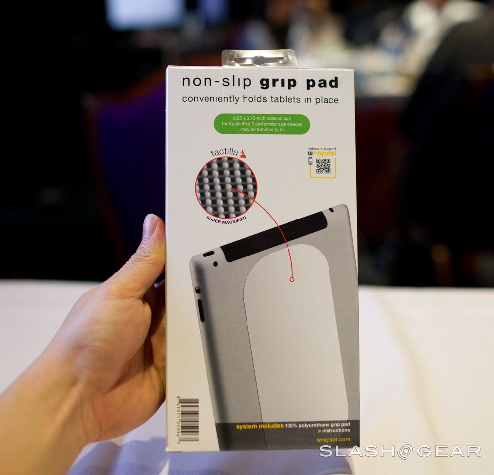 We were here at ShowStoppers 2012 in CES with Wrapsol. Today they unveiled the Wrapsol non-slip grip pad. We've seen products that do essentially the same thing before, but not with their superb 'tactile' technology. Tactilla isn't velcro or adhesive. It creates a wider surface area and tension so that i can even grip clothing.