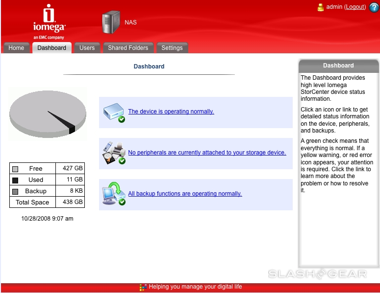 While setup is quick, recovery and decommissioning isn't. Although a RAID-1 array means that, in the case of one of the 7,200rpm, 16MB-cache SATA-II hard-drives failing, your data isn't lost, Iomega tell us that replacing the broken drive yourself will void the manufacturer warranty (one year standard, two years costs $149.95). That basically means that, if you get an email from the NAS saying a disc is either going or gone, you have to send the whole thing to Iomega to have it repaired. It also prevents you from adding capacity as hard-drive prices come down and your storage needs increase.
