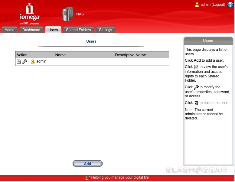Unsurprisingly the StorCenter ix2 uses a web-based administration system, accessible from any computer on the network and password secured. Here you can set up individual accounts and groups, limit access to certain directories and give different levels of read/write priviledge. One feature notable by its absence is space quota management, where users are permitted a limited amount of storage on the NAS; Iomega tell us that this, together with remote file access and seemless links to online storage, are planned for future software updates. Nonetheless, the setup GUI is clear and straightforward, and it's simple to establish user groups and identify which folders contain media and as such should be monitored by the UPnP/DLNA streamer.