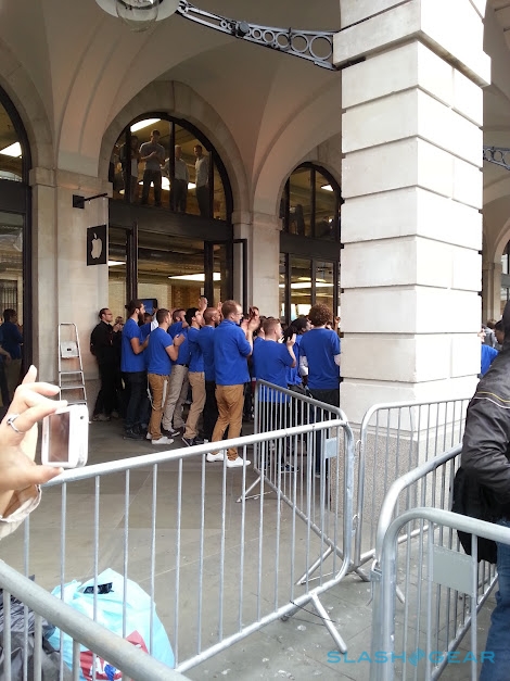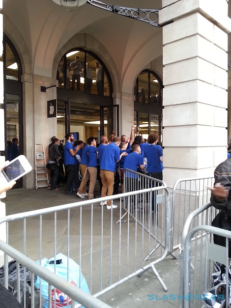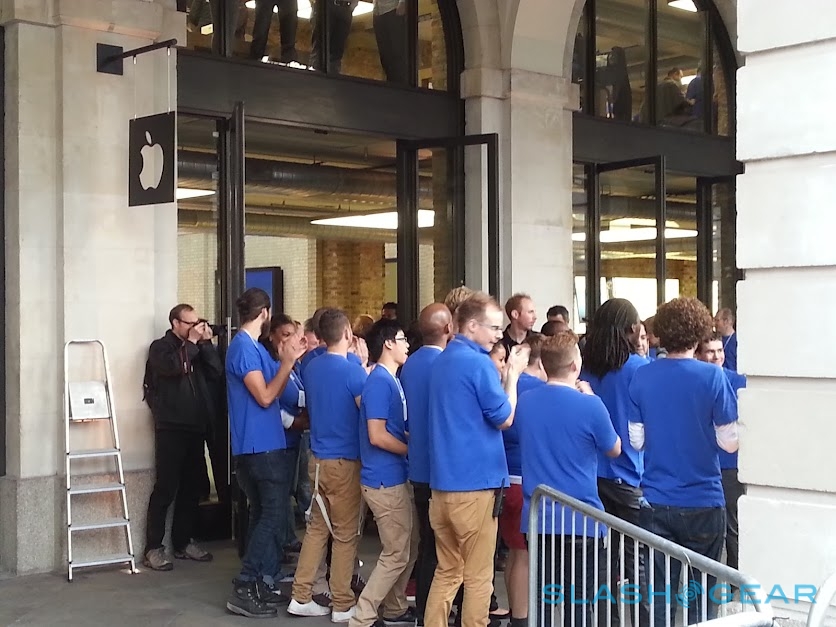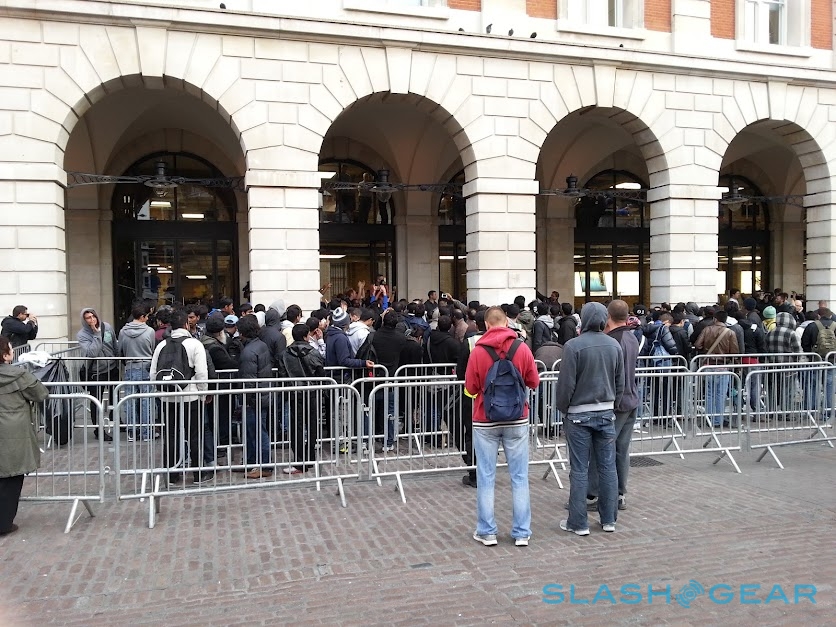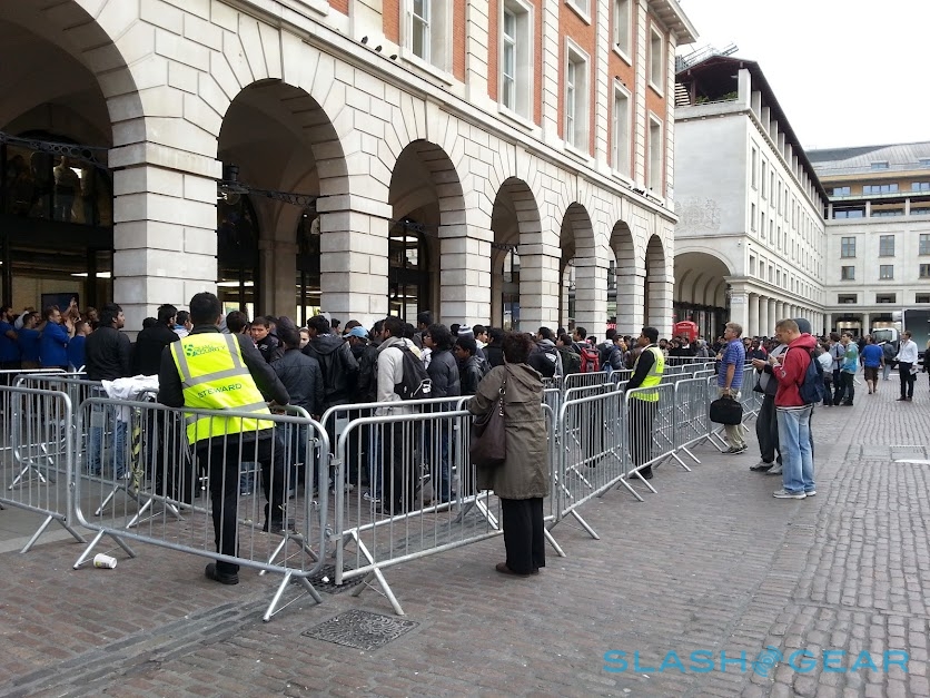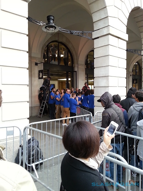In London, the queue outside of Apple's Covent Garden store had been split into two to make it more manageable, with security guards and fencing to corral shoppers through to a cheering phalanx of Apple Store staff. Those waiting were allowed through in small groups, each punctuated by applause, to spend £529 or upward on an unlocked iPhone 5.
