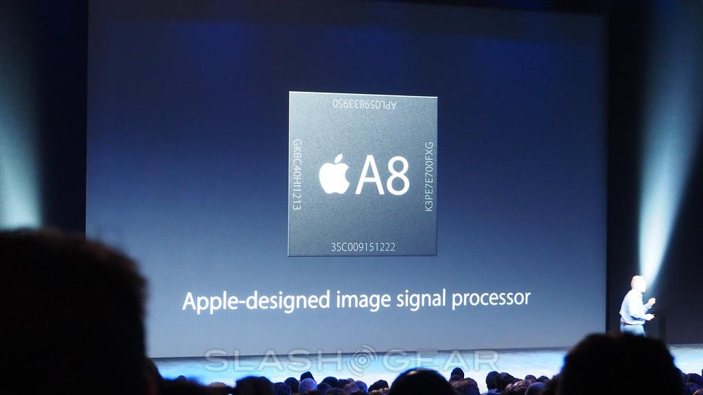 The 8-megapixel True Tone sensor is paired with a 5-element lens, as well as a brand-new image signal processor in the Apple A8 chip. The pixels themselves at 1.5u, and there's an f/2.2 aperture.