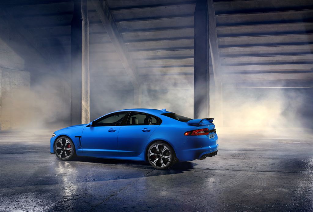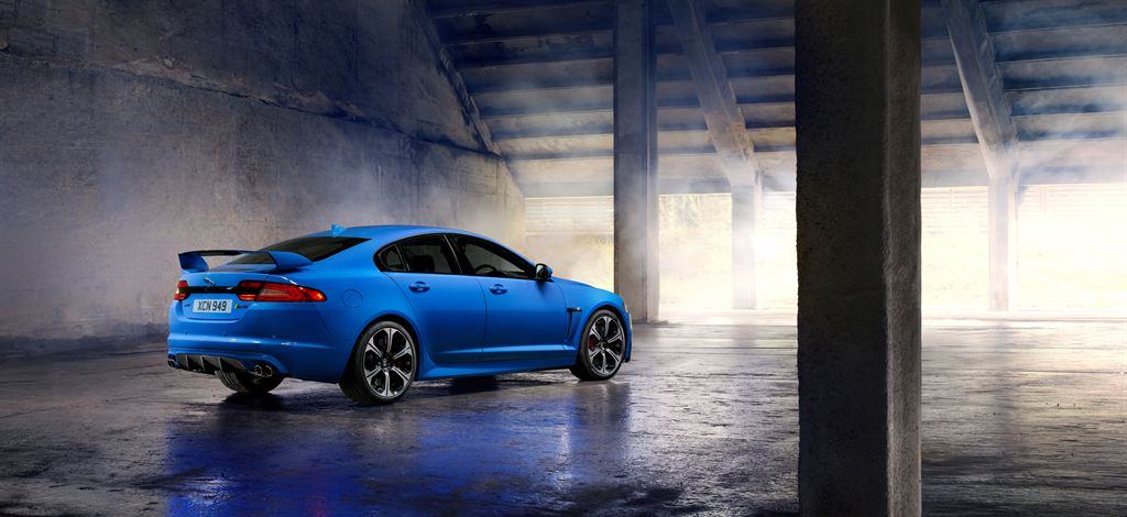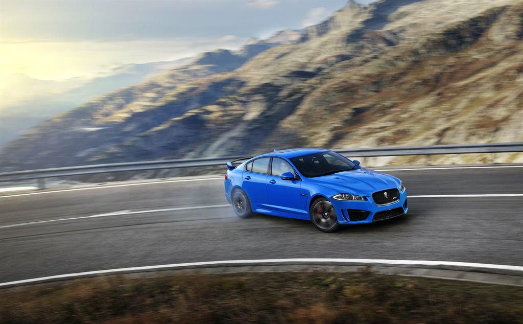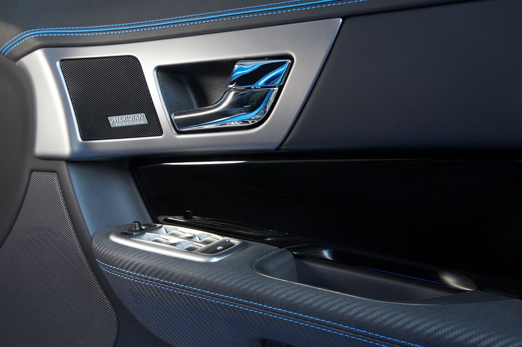 Lashings of carbon fiber both outside and in, extended side sills, aeroblade moldings behind the front wheels, and a bootlid spoiler help distinguish the XFR-S' appearance, along with gloss black trim replacing what would be chrome on the regular car. Lift is reduced by 68-percent, helped by new air channeling underneath. Jaguar will offer five color options: blue, white, grey, red, and black.