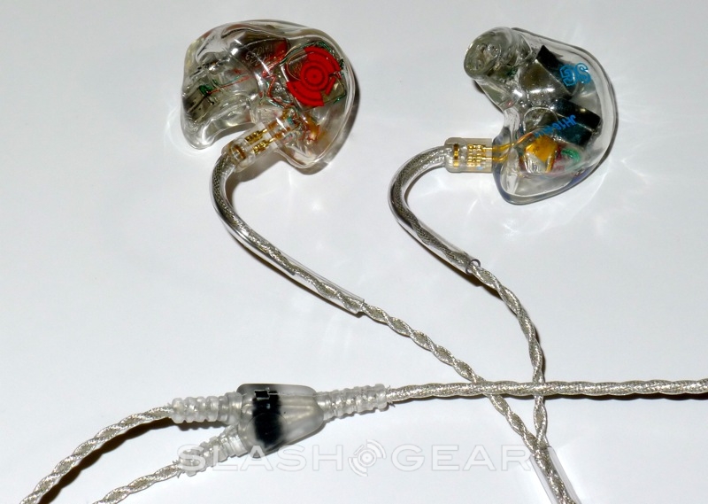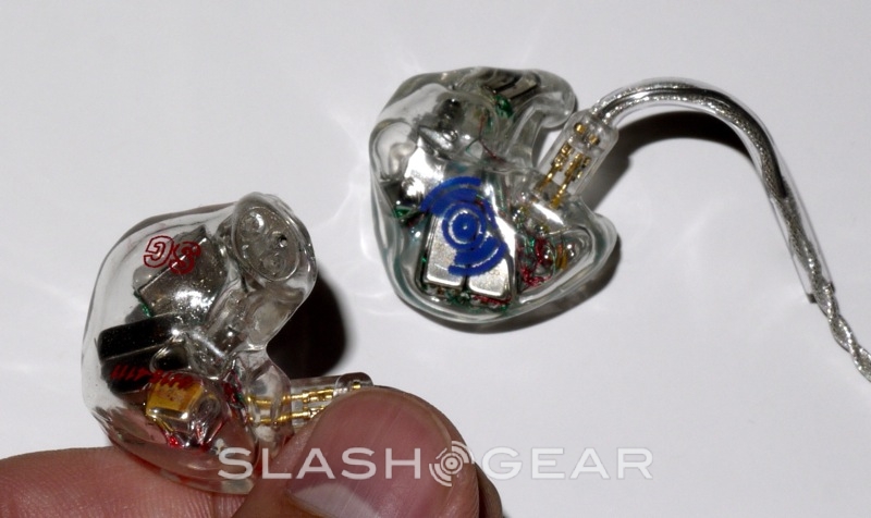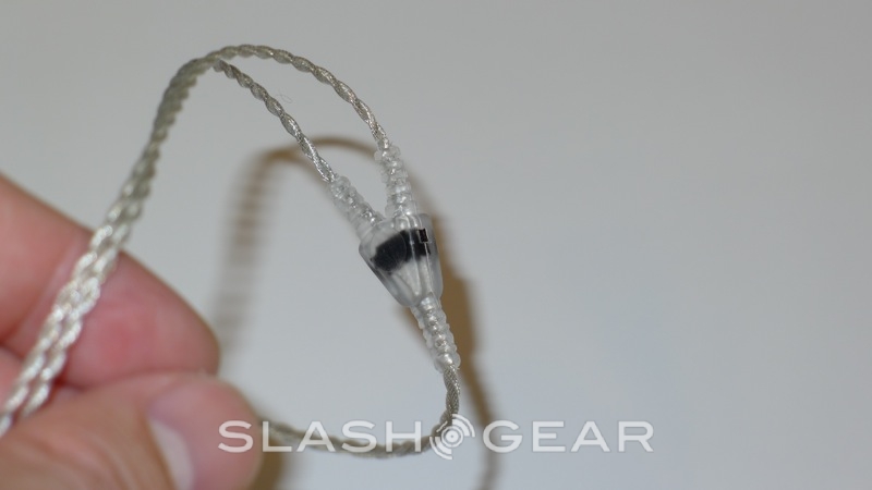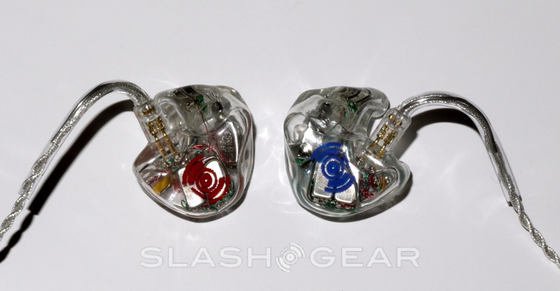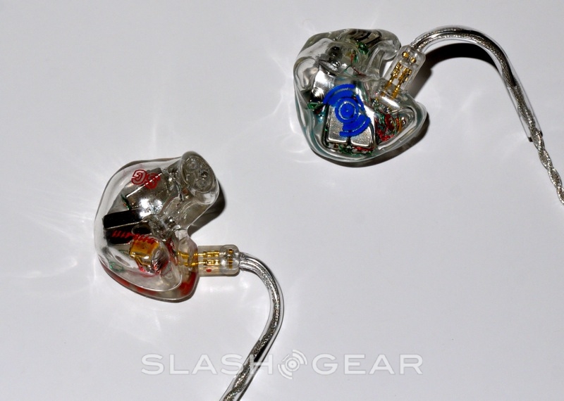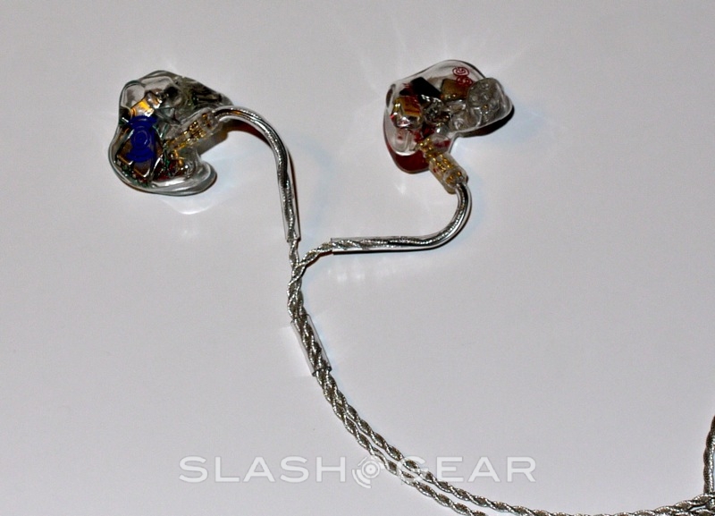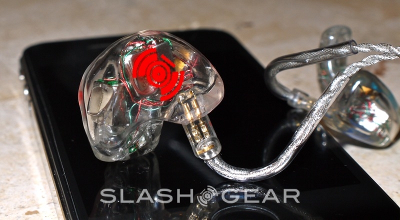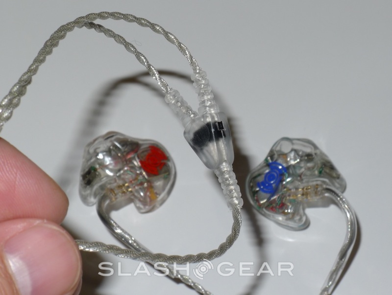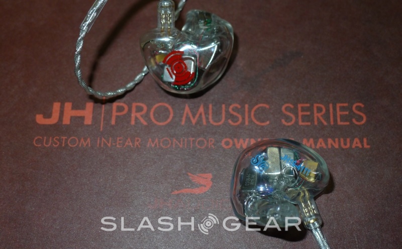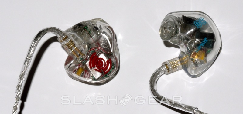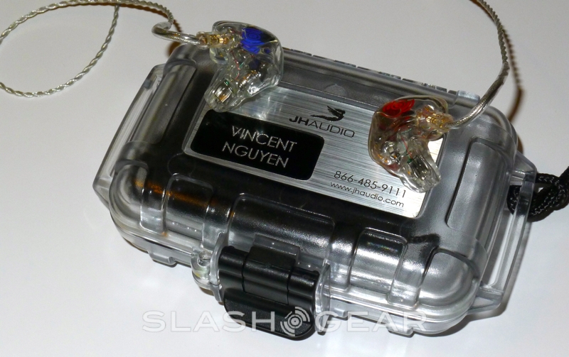 They arrived in a waterproof Otterbox case, complete with a personalized nameplate, together with a soft carrying pouch and a wax-removal tool (basically a stick with a wire loop on the end). JHAudio offer a choice of 53 different shell color options (in both translucent and solid finishes) together with optional custom artwork if you send them a high-resolution image; you can see the SlashGear roundel on each side of our review set. The headphone cables – available in either clear (so you can see the silver wire inside) or black – are detachable, and JHAudio sell 18-, 48- and 64-inch replacements.