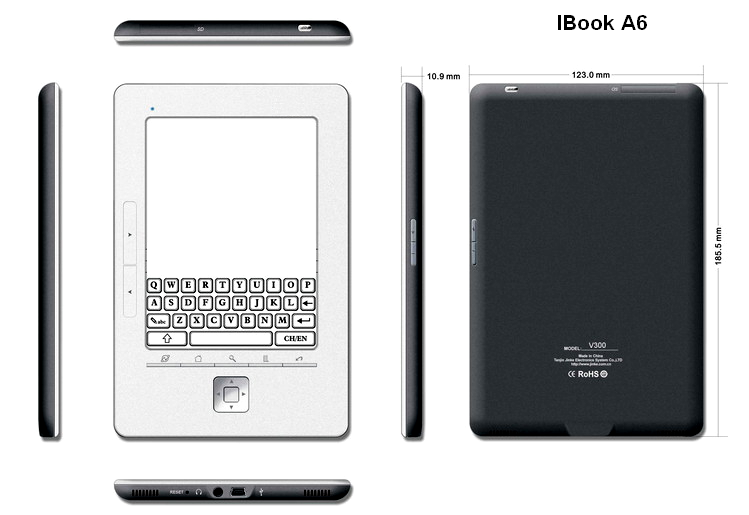 The Jinke A6 has a 6-inch, 600 x 800 display capable of 16 levels of grayscale, together with 2GB of onboard storage and an SD slot capable of taking up to 16GB cards. It measures 185.x x 124.6 x 10.9 mm and weighs 260g with the 1,600mAh battery in place, and automatically flips page orientation using an integrated accelerometer. Navigation is either via the hardware controls or the multitouch-capable display.