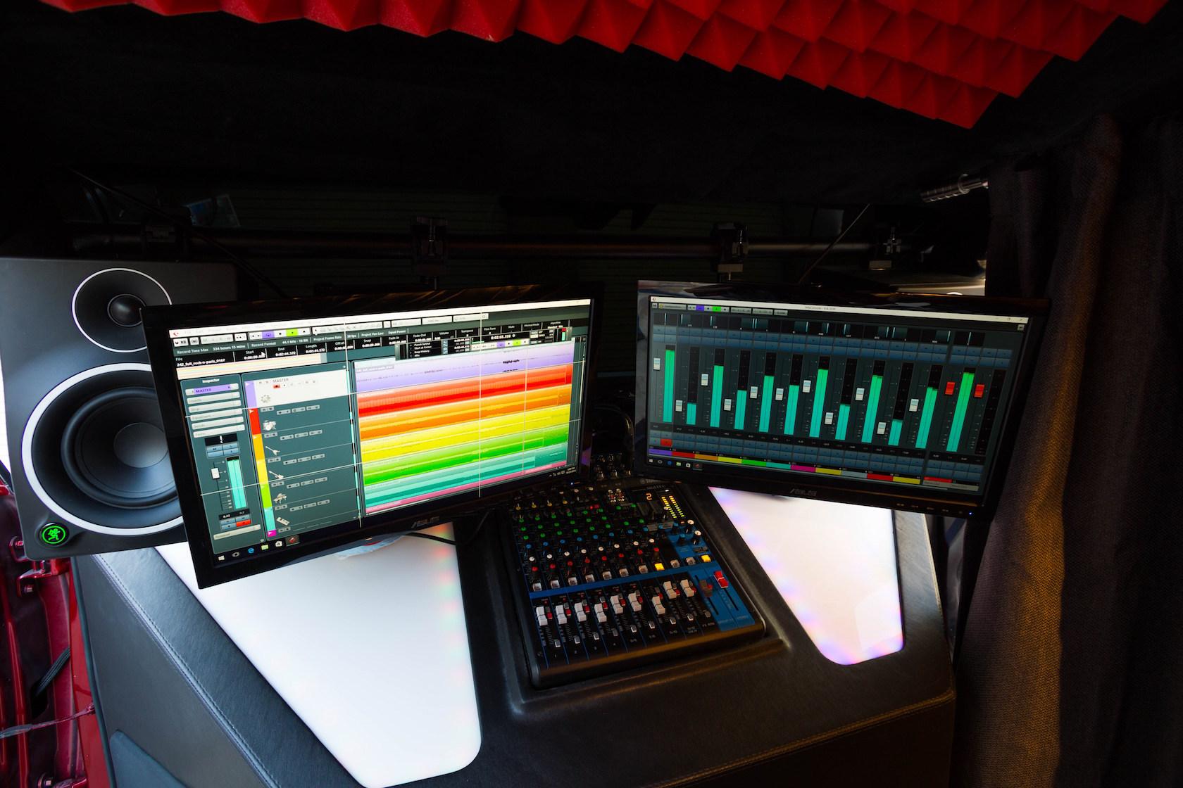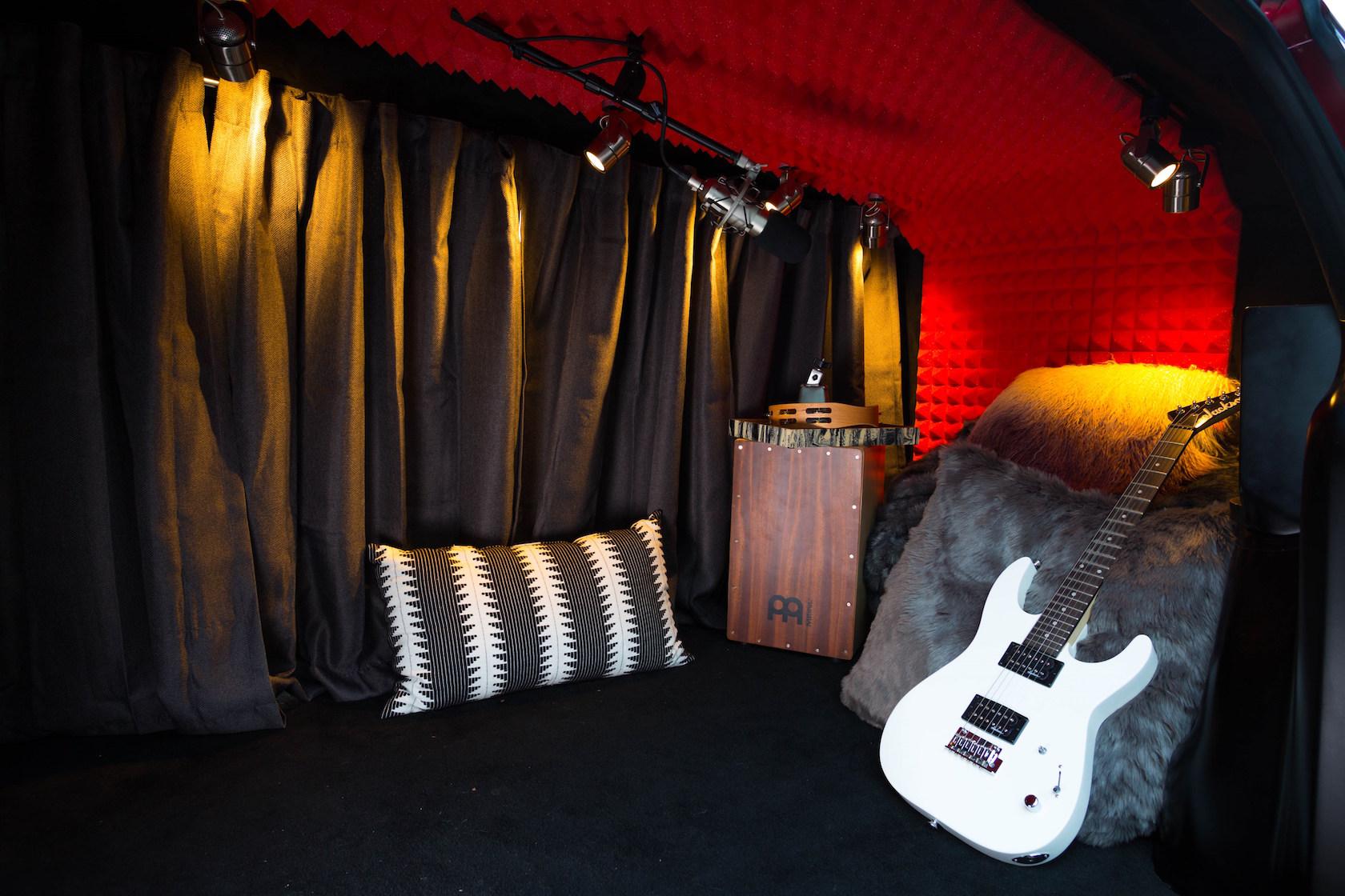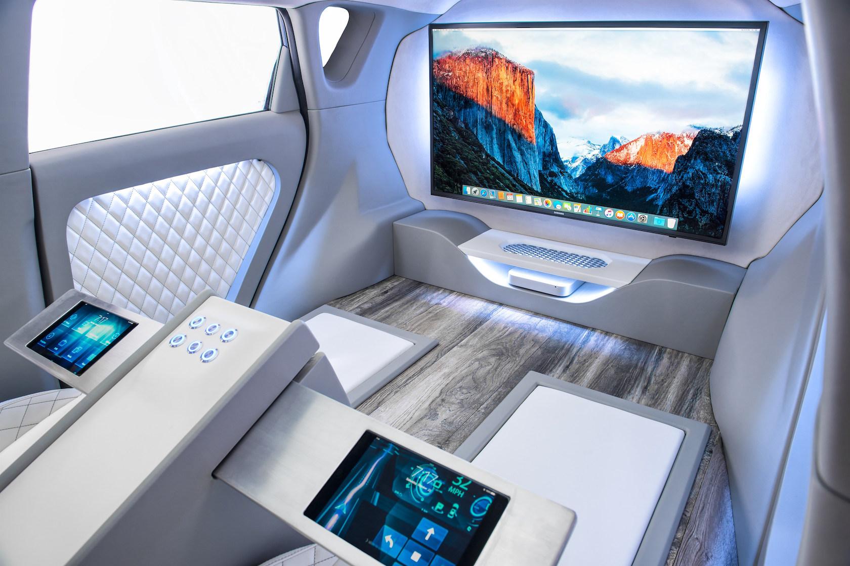 In front of them is a 40-inch Samsung TV, hooked up to a Mac Mini and a surround sound audio system. Between them is a center console which motors out to reveal a pair of tablets. They're used to navigate through the infotainment system as well as instruct the autonomous car where to go.