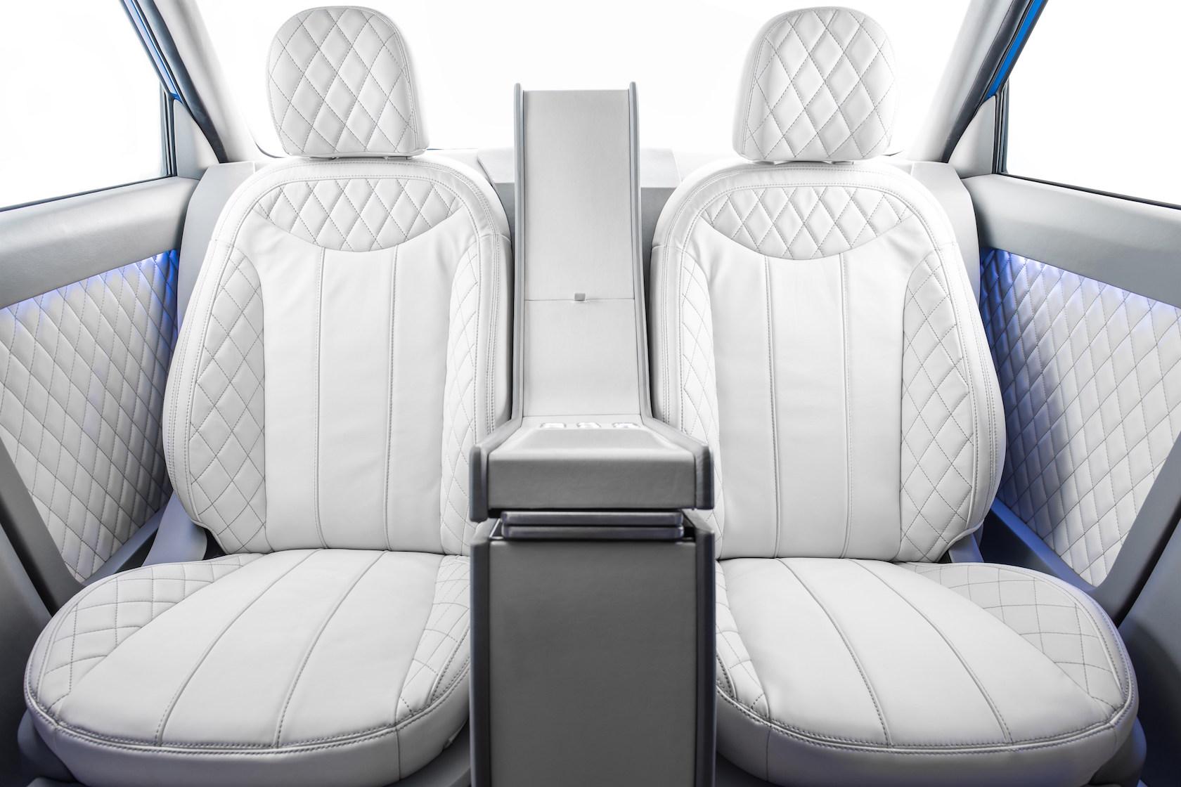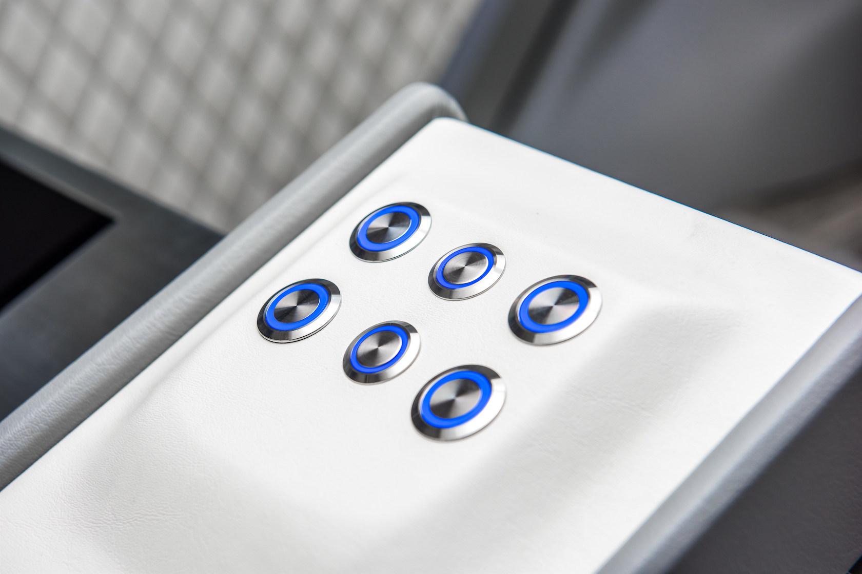 Unlike most visions of luxury, which include deep pile carpet and plenty of wood, the Soul First Class opts for a more Scandinavian interpretation. That means white and gray leather – complete with diamond contrast stitching – together with gray wood flooring. There's LED mood lighting too, of course.