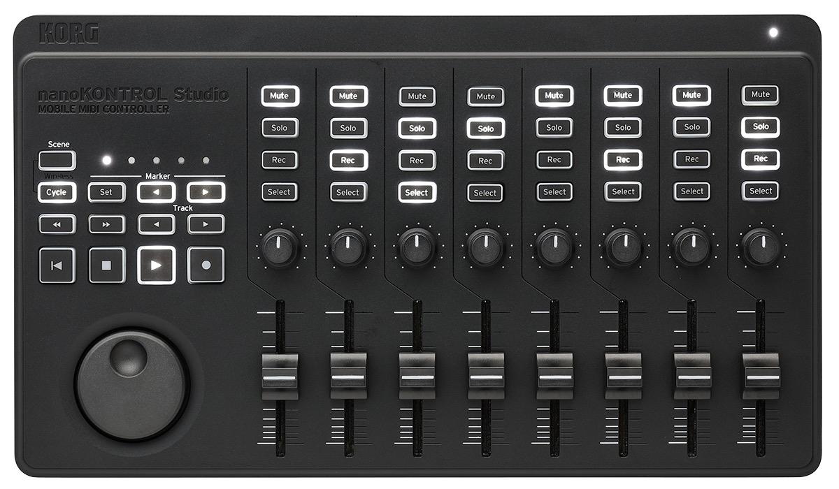 As for the nanoKONTROL Studio, that's more about controlling your DAW. It has eight knobs, eight sliders, and 32 buttons (Mute/Solo/Rec/Select for each individual slider, together with transport buttons, markers, scene controls, and more.