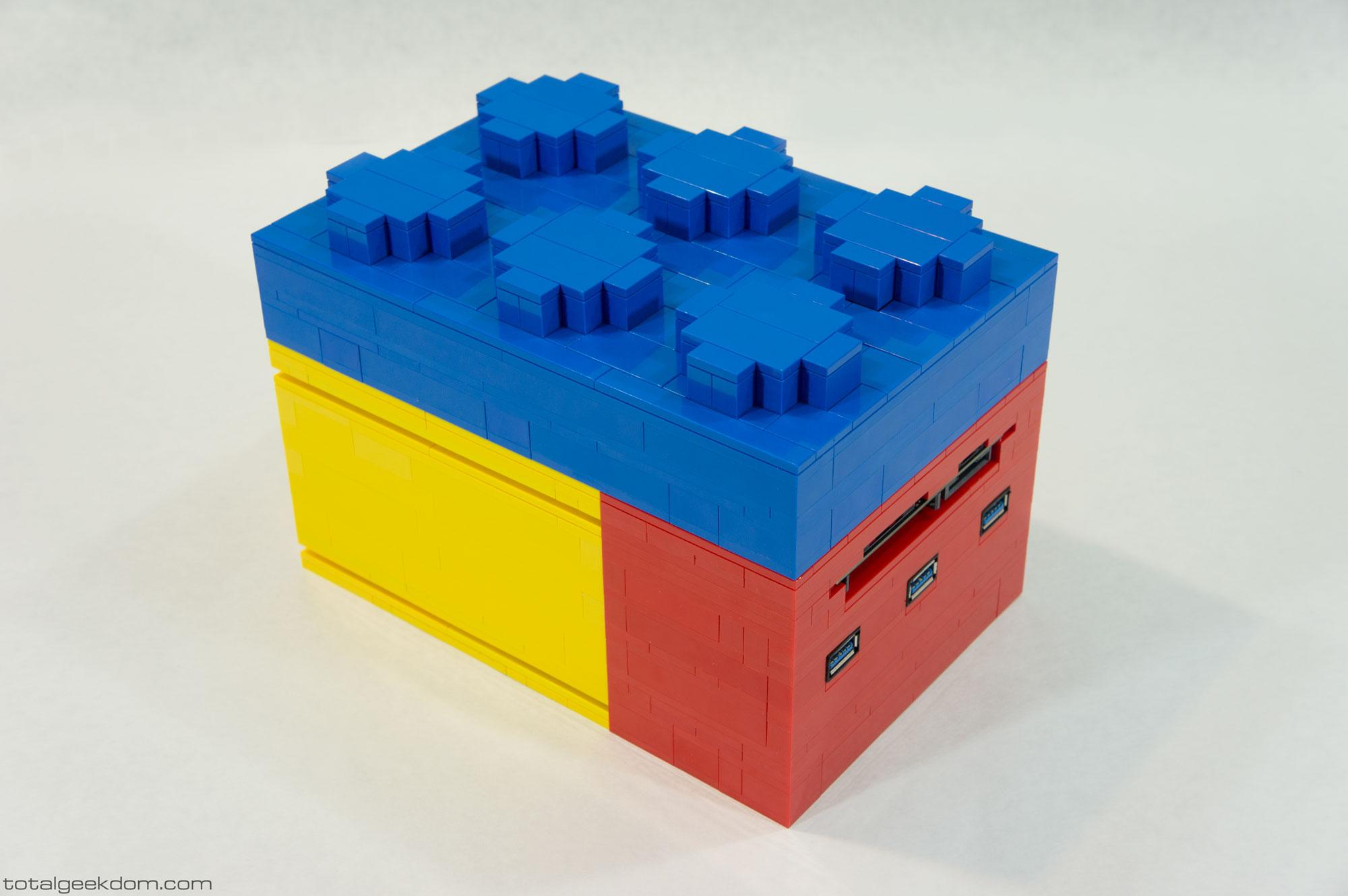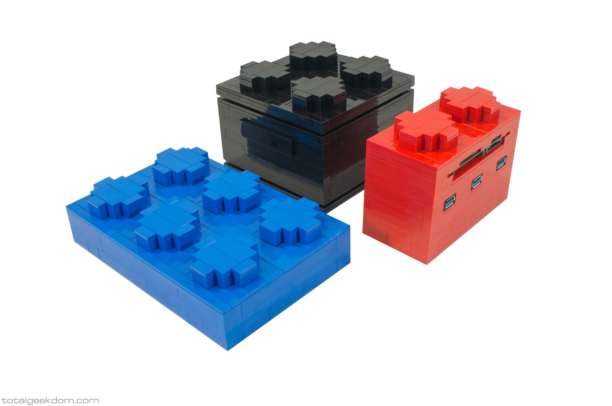 The result? A base system and two add-on modules that pretty much look like enlarged LEGO Bricks. The main PC is a 4 x 5 x 5 inch cube that follow the 2x2 LEGO shape. An external hard drive add-on is a 2x3 brick, and a Card Reader/USB hub is a 1x2 brick. Place them apart or snap them up together, it's the ultimate LEGO slash PC fan dream come true.