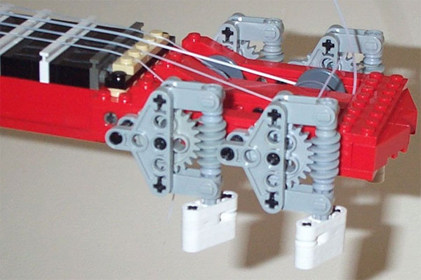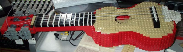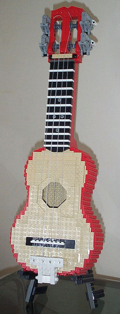 The instrument in question is a ukulele. This little thing looks like a shrunken guitar that I always think of people in Hawaii sitting around playing. The builder is Ross Crawford and the photos show an impressive design. He notes that the build had some challenges, namely getting the shape, strength, tuning, and intonation. I would imagine those were very big challenges with the instrument being made from LEGO.