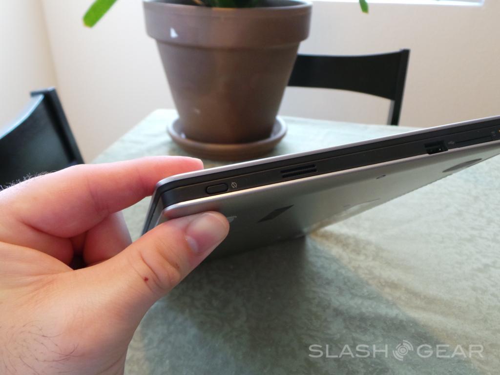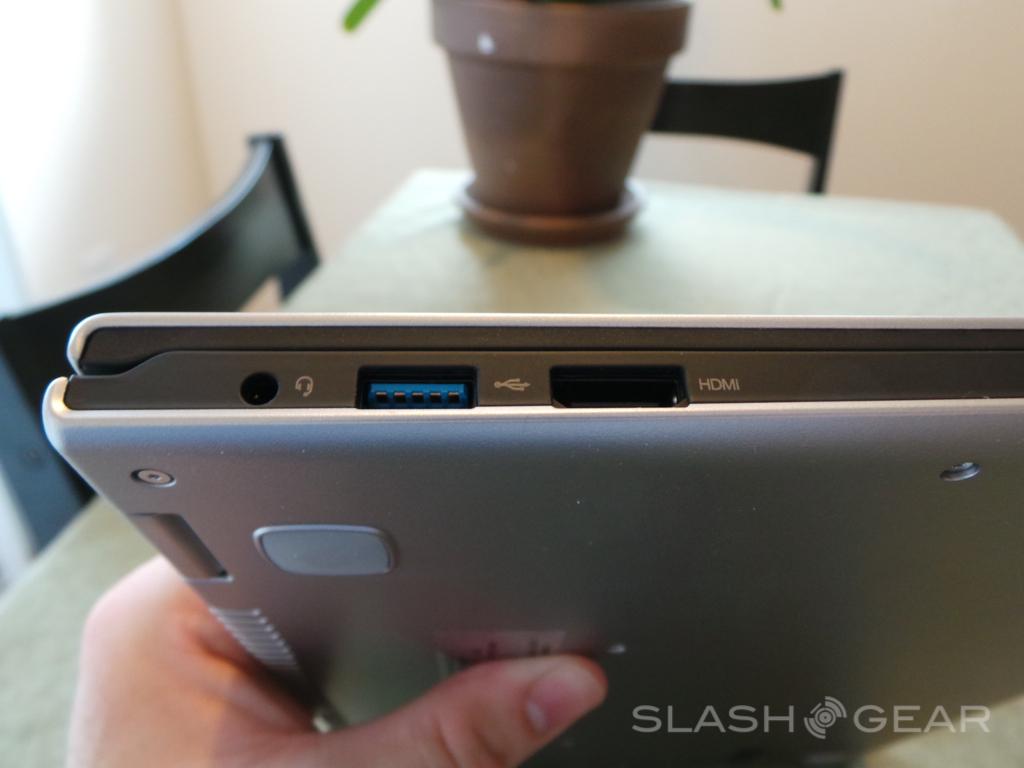 Again, nothing's changed here. We have the same soft to the touch durable materials on the outside and magnesium aluminum frame, followed by a sleek build and chicklet keyboard under the hood. The entire wrist rest area is almost a soft to the touch fabric as well, which has us worried about longevity. On the outside is the power button on front, USB 2.0 on the right and 3.0 on the left (in blue), followed by HDMI out and a 3.5mm headphone jack. Back to the right edge we have a screen orientation lock, SD for expanding on the 256 GB of storage, and the proprietary charging port. Don't forget your cable or you'll be sorry out of luck.