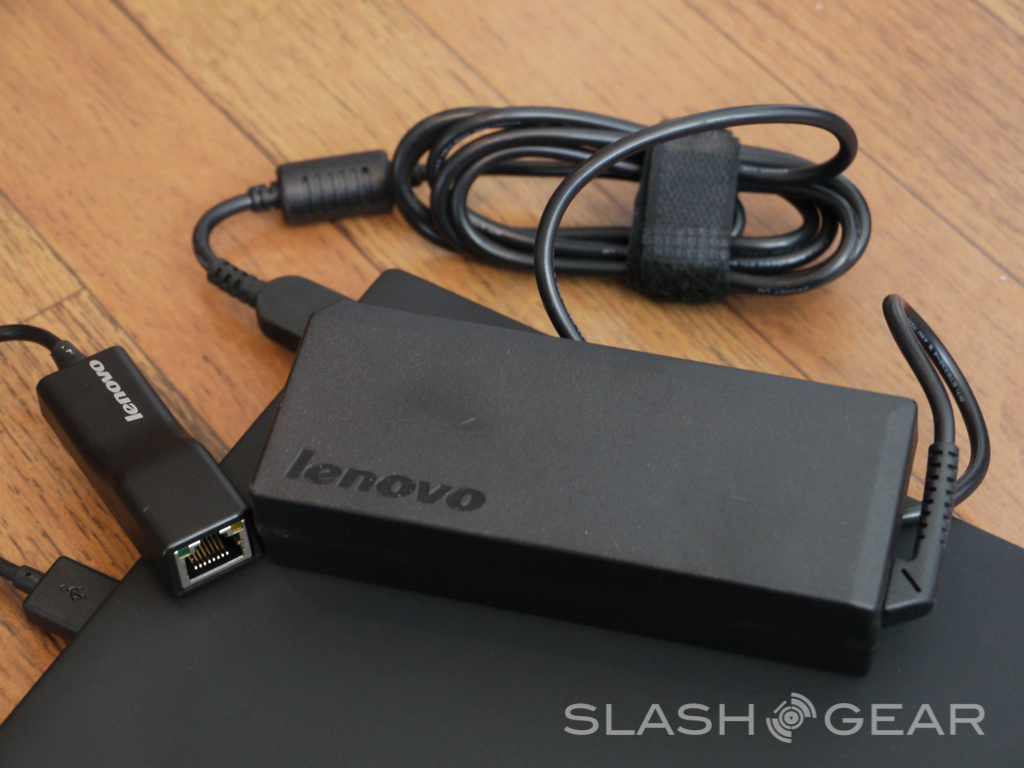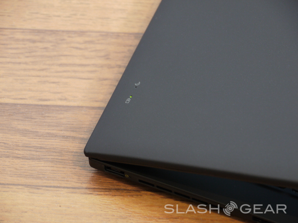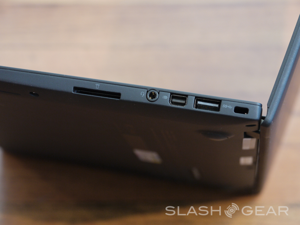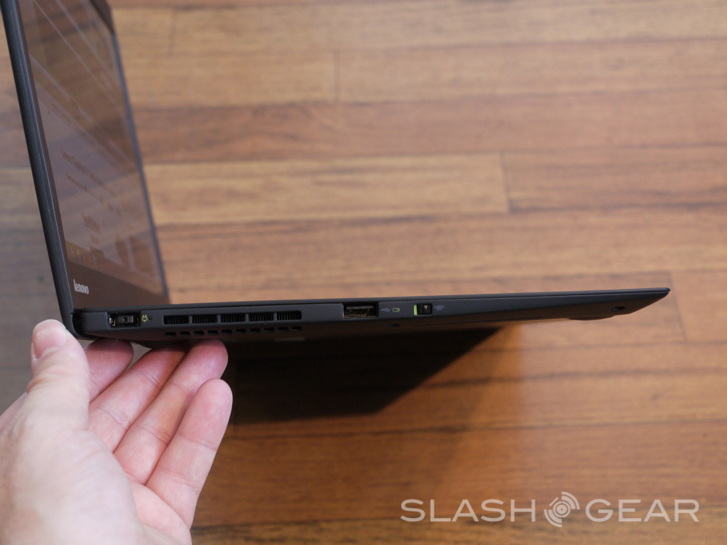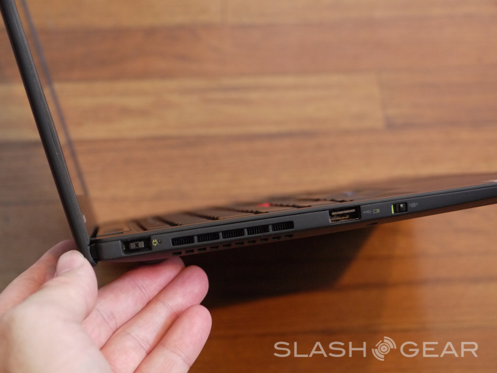 As mentioned above Lenovo outfitted this Ultrabook with only two USB ports, one of which is USB 3.0, or as they call it — Superspeed. You'd never know it but a small barely visible SS logo is near the right side USB port (see above image). The right side also contains the Kensington lock, display port, 3.5mm headphone/microphone, and the full size SD. Around to the left is the charging port, vents, and the regular USB location followed by a Bluetooth and WiFi radio toggle switch.