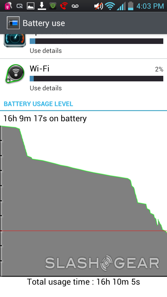 Leaving it connected to the Internet – be it T-Mobile's mobile data network or my own Wi-Fi connection – while the phone was asleep didn't do much to drain the battery either. You won't have a problem getting a full day of use out of a full charge, and if you're not the type who's on their phone constantly, you might even have enough juice left over to make it through a second day.