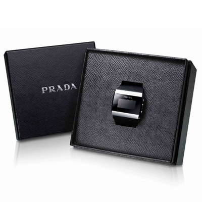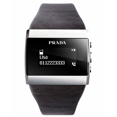There's also a microSD card slot, and the Prada II (aka the LG KF900) is apparently happy playing DivX video files. It measures 104.5 x 54 x 16.75mm and weighs 130g; the battery is good for 400hrs standby or 3hrs talktime. The Prada Link watch, meanwhile, weighs 51g, has a 0.9-inch 120 x 56 OLED display, battery good for 48hrs standby and leather strap.