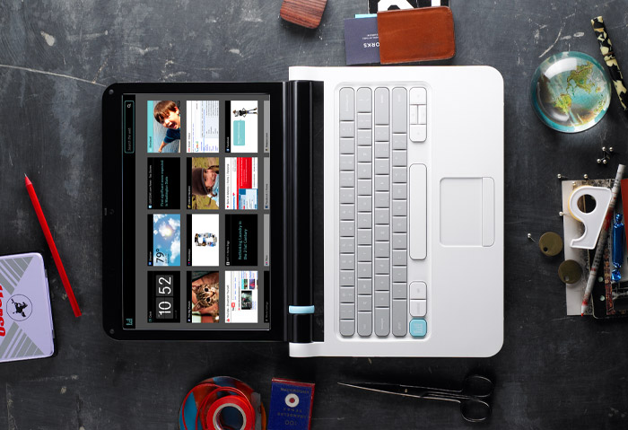 When not used as a conventional laptop, the litl webbook's 12" screen and keyboard flip around its patented hinge so the computer can stand upright like an easel. With its screen exposed, the litl webbook is now ideal for passive or "lean back" web activity like enjoying photos, listening to music, or consuming news, weather, and other web content.