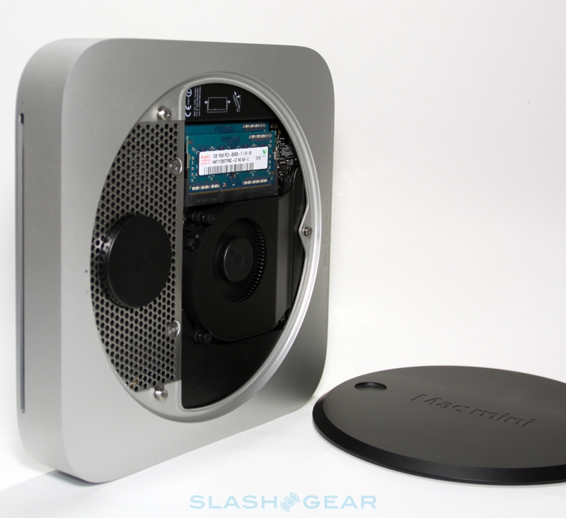 While you might assume the Mac mini was a relatively closed box when it comes to user upgrades, you'd not be entirely correct. Upend it, twist off the circular base-plate and you can easily access the two RAM slots so as to upgrade the memory (something we'd recommend doing yourself, since Apple's factory-fit upgrades are, as ever, on the expensive side). Unfortunately the easy access ends there: if you want to switch out the hard-drive, for instance, you'll need to get out the screwdrivers and set aside a fair chunk of time, since Apple has had to perform some origami to get everything to fit.