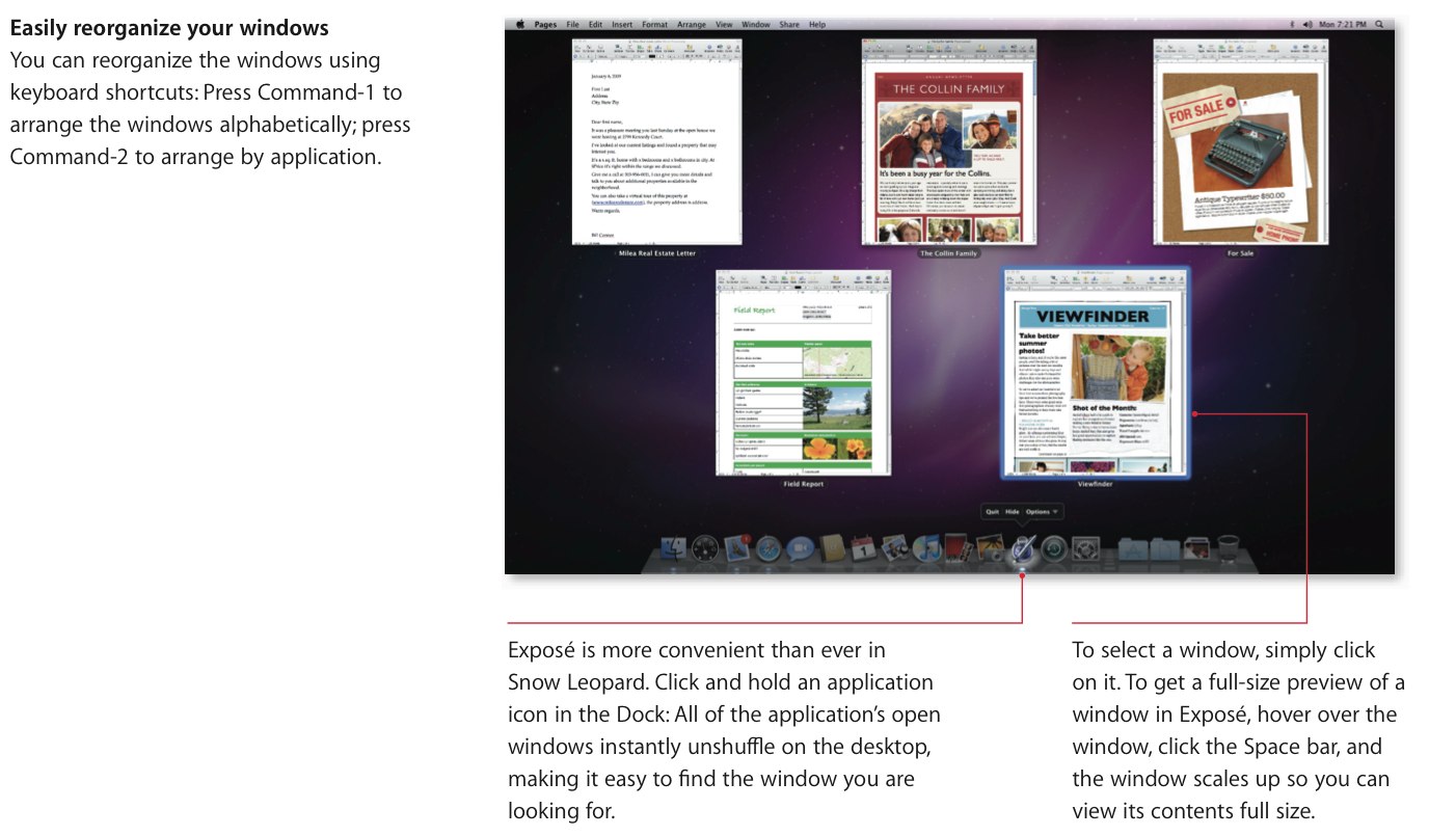 The most obvious changes once Snow Leopard is installed are, arguably, those you'll spend most time interacting with on a day-to-day basis. The Apple Dock, Finder and Preview features all get an overhaul, each intended to make navigating files and applications more straightforward. Exposé has become more measured in its layout, following a grid rather than displaying previews into any available gap, and has allowed Apple to permit sorting either alphabetically (Command-1) or by application (Command-2). We're particularly enamored with the new Dock Exposé feature, where clicking and holding an application icon in the Dock spreads all open windows of that app out; you can then click the required window or hover over with the mouse, hit the Space bar and see a full-sized preview.