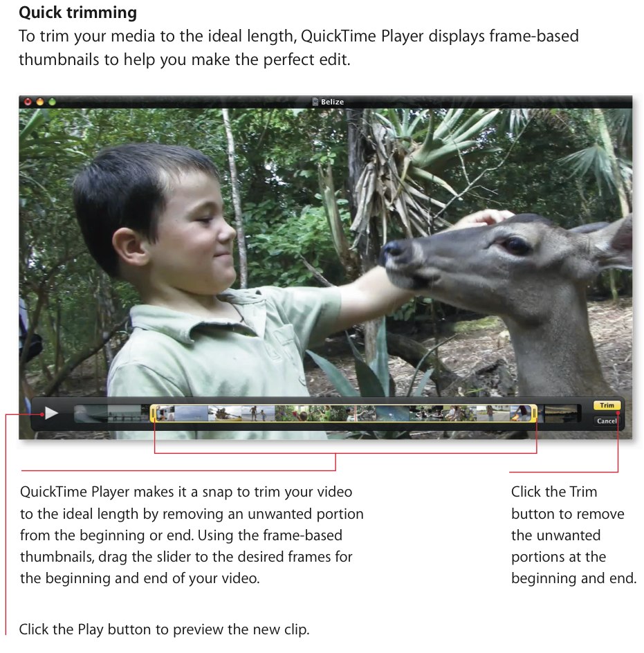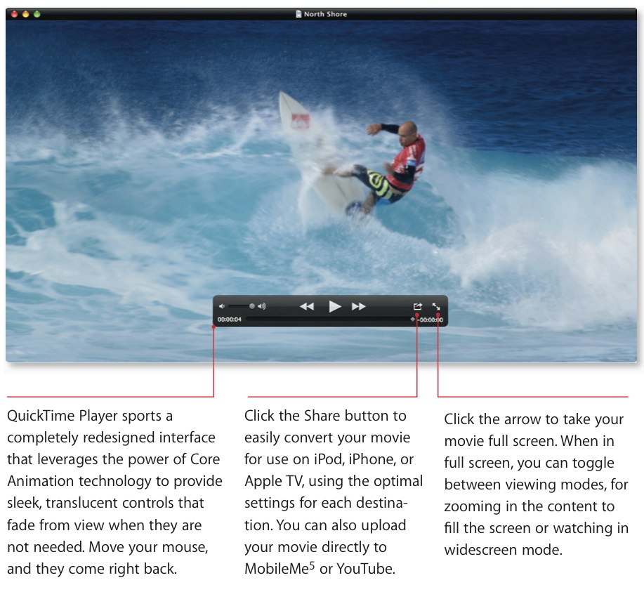 QuickTime X also supports the standard HTTP Streaming protocols, a new system that promises to not only accommodate various data rates but also bypass the sort of firewall or proxy server issues that can affect other streaming systems. It works by cutting the stream into a number of small HTTP downloads, organized by an initial M3U playlist; at any one time there are multiple streams encoded at different bitrates, to suit differing speeds of connections. It's a clever system, but so far a fledgling one: Apple intend to propose it as a new internet standard for streaming media, but they're only at the early stages so right now it's very much a work in progress.