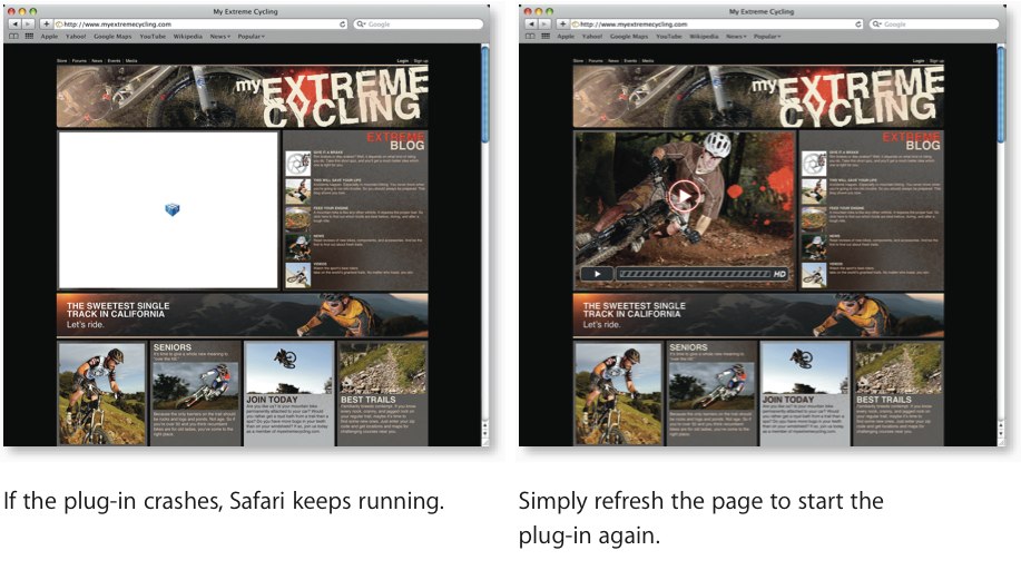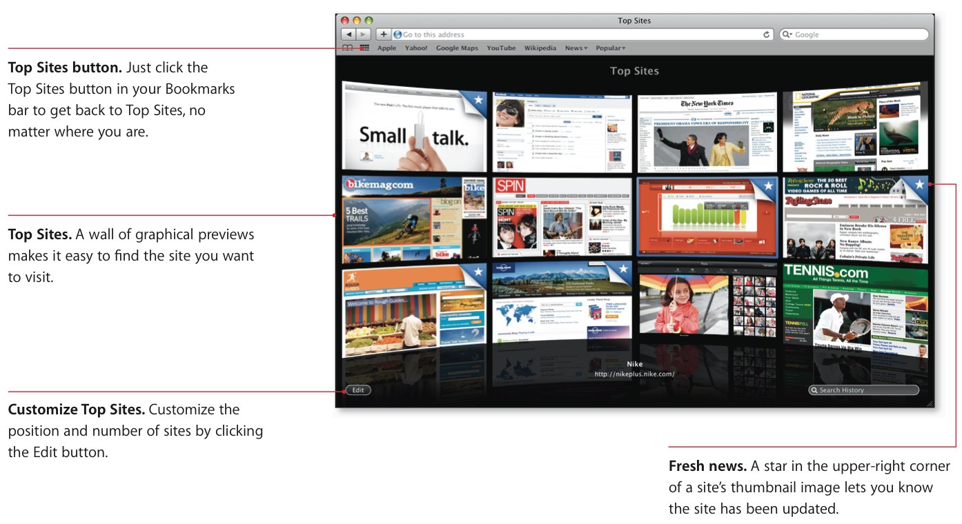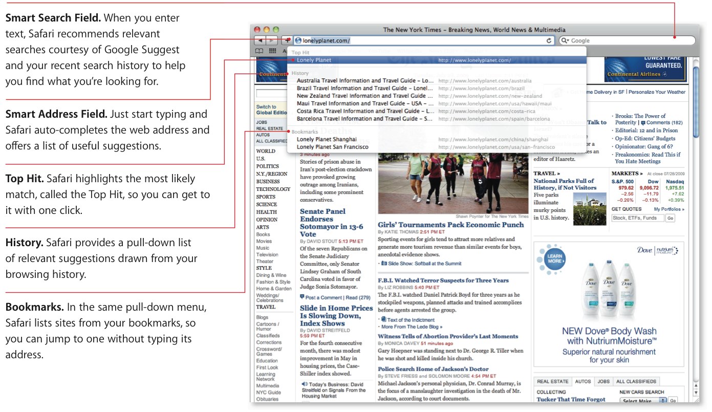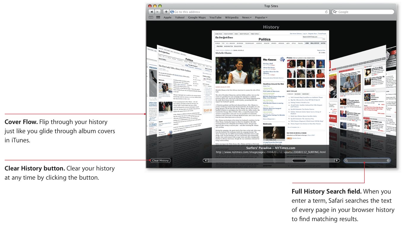 Otherwise it's the same Safari 4 that you likely know from before, with Top Sites automatic thumbnail previews based on frequency of visits, full history search with Cover Flow browsing, and a multifunction address bar which offers search results, bookmarks and history entries. Apple also quote fewer crashes thanks to plug-ins being kept separate from the core Safari program though, as with any current browser we've played with, heavy use can still result in an unexpected shut-down. Still, Safari 4 does a decent job of then reopening lost tabs – properly shared across whichever windows held them – once you restart.