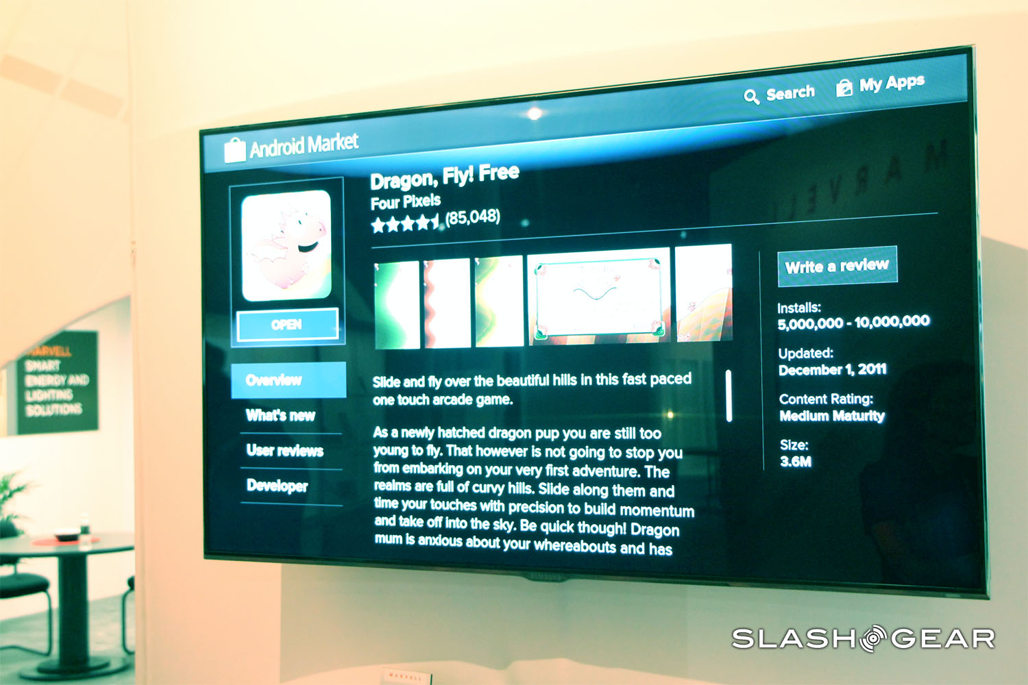 The box on display is just a mock-up design for Marvell's partners, but already it's considerably smaller and lighter than conventional units. Output includes HDMI and standard RCA. One of Marvell's unique additions to the platform is integrated upscaling, for the elements of Google TV that don't look so great on a 1080P television, like icons from downloaded apps. Marvell wasn't ready to announce its specific partners or their intentions at the show.