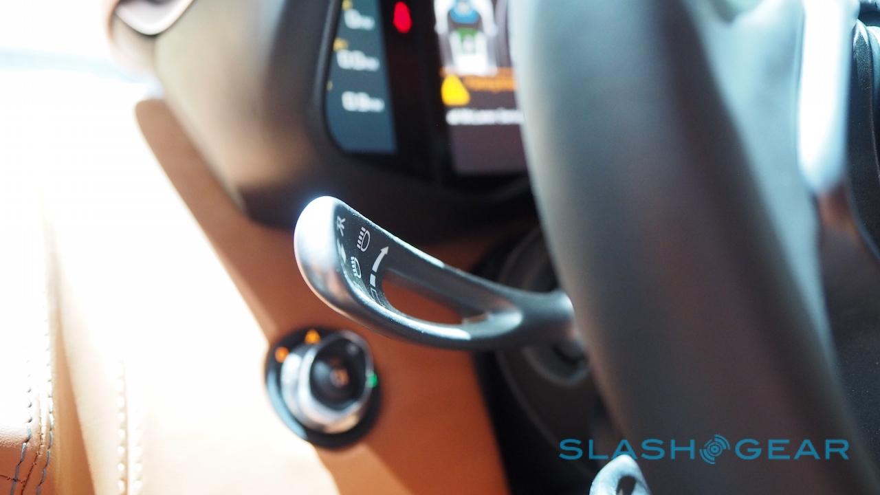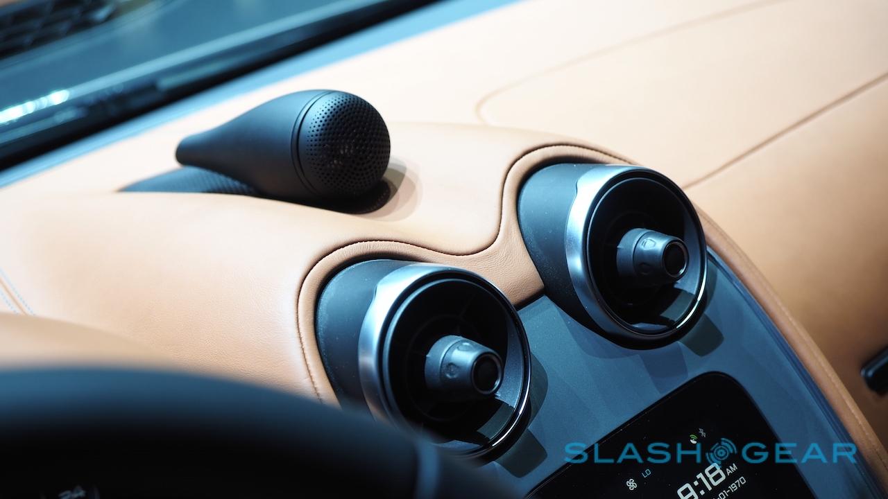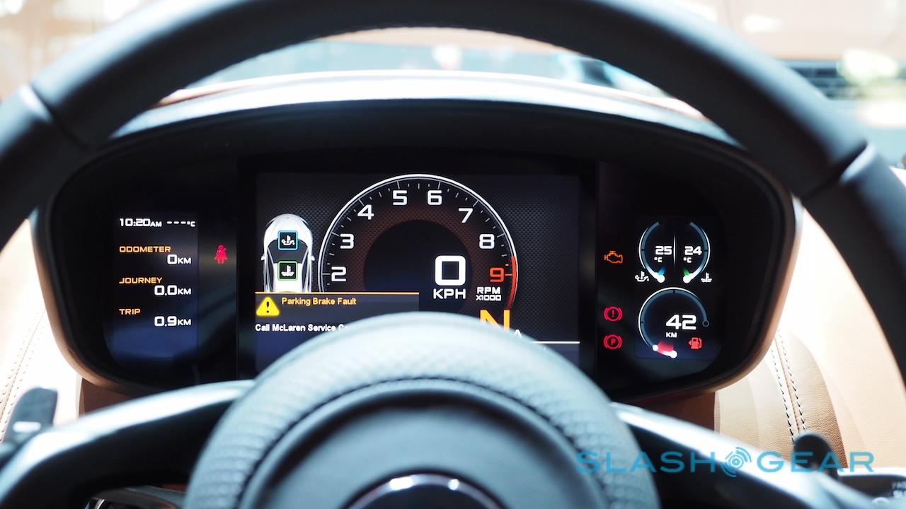 McLaren's infotainment system uses a 7-inch touchscreen, integrating all the controls including HVAC, Sirius radio, navigation, and Bluetooth streaming. It also records track day telemetry, including driver profile graphs and video footage. Storage bins are squeezed into the doors, adding to the glovebox and central armrest space.