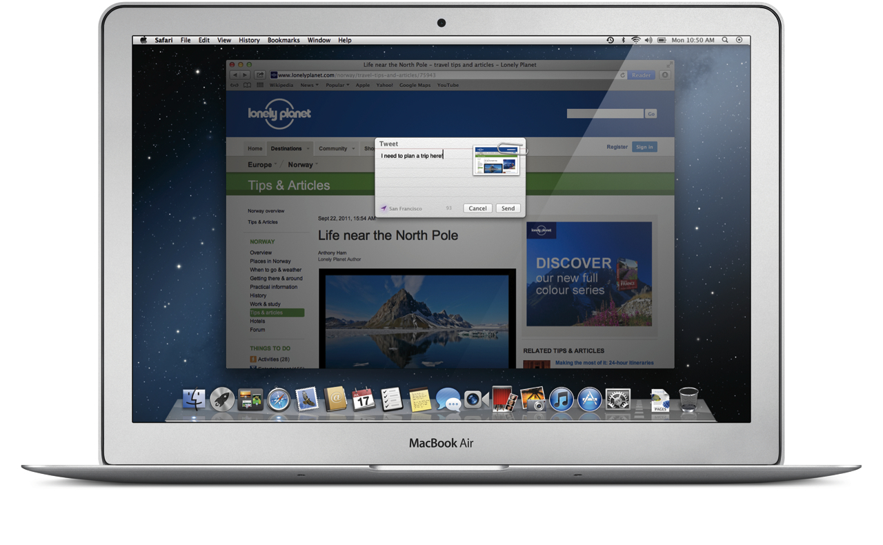 Although Twitter is just one of the Share Sheet options, it's the third-party service which is most consistently integrated with Mountain Lion. Like in iOS 5, once you log in for the first time you can tweet content across Safari, Preview, Photo Booth and Quick Look, among others, in addition to seeing responses and direct messages in the Notification Center (though not in the initial beta).