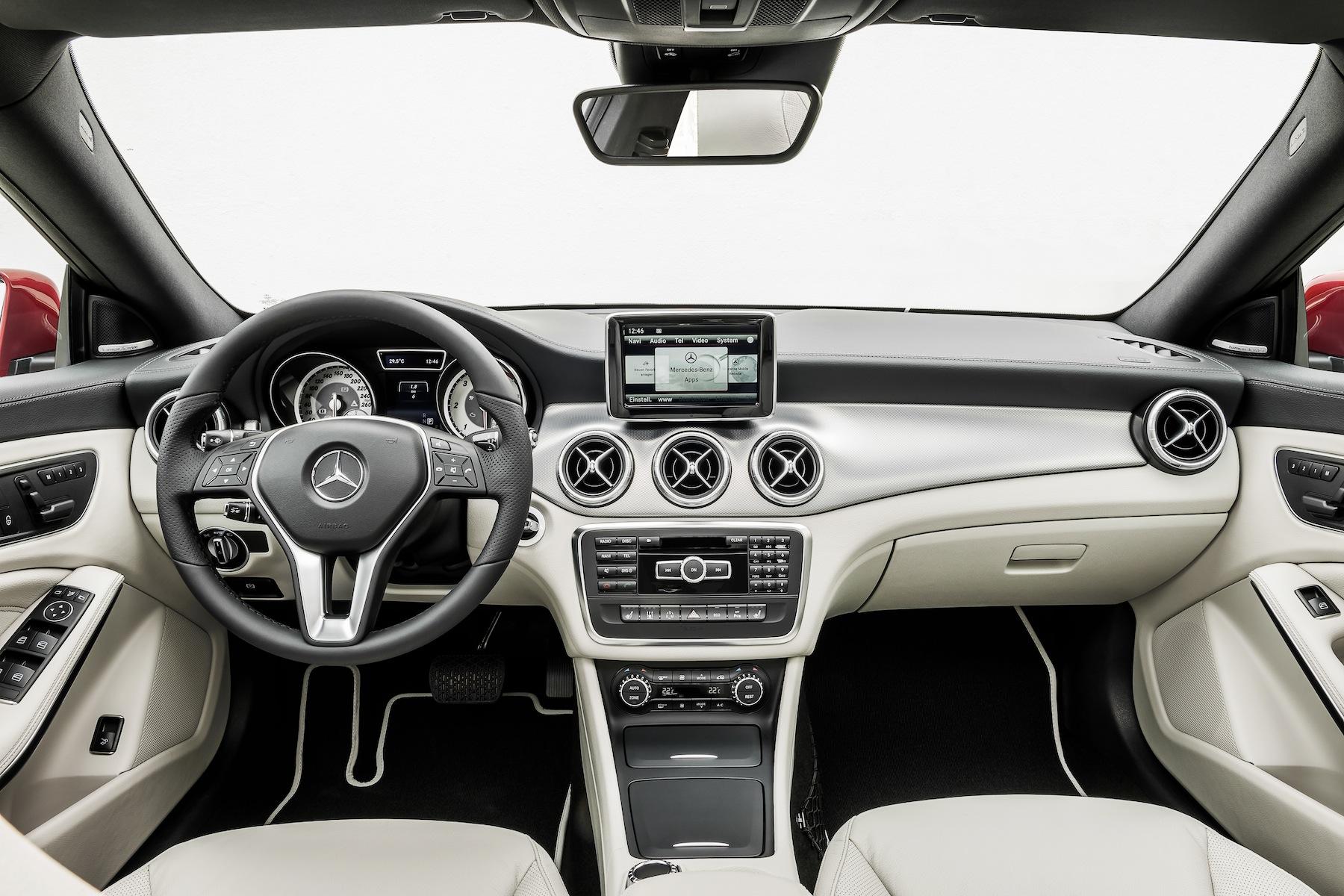 Inside, there's Siri integration if you're an iPhone user, with Glympse real-time location sharing, Facebook and Twitter social networking, internet radio, Garmin-powered navigation with Google Street View graphics, and the latest version of Mercedes' COMAND Online infotainment deck. That has Bluetooth, real-time traffic, and more. Ambient fiber-optic lighting is an option, while the four seats emphasize the outer seats, with Mercedes pushing the CLA as a 2+1-seater.