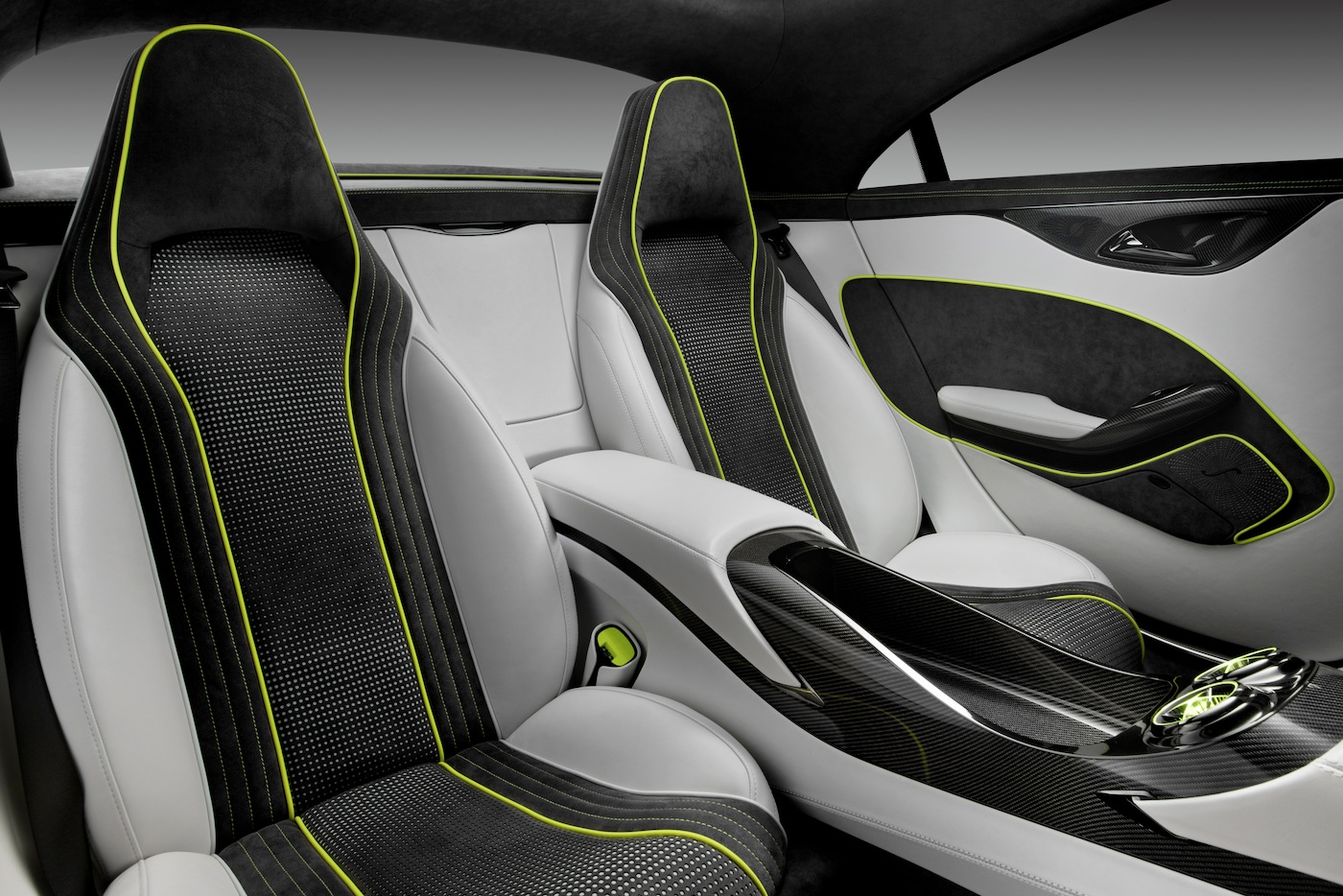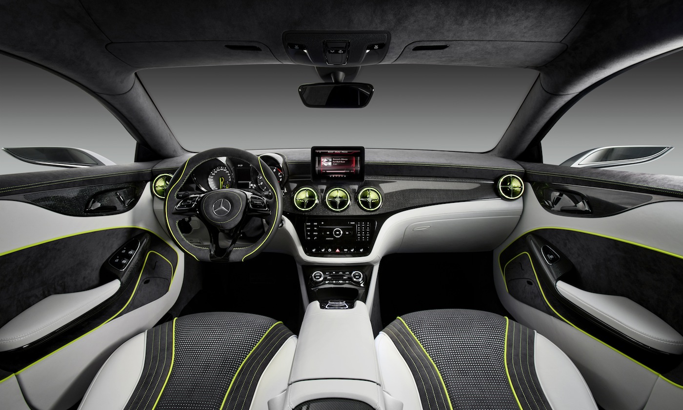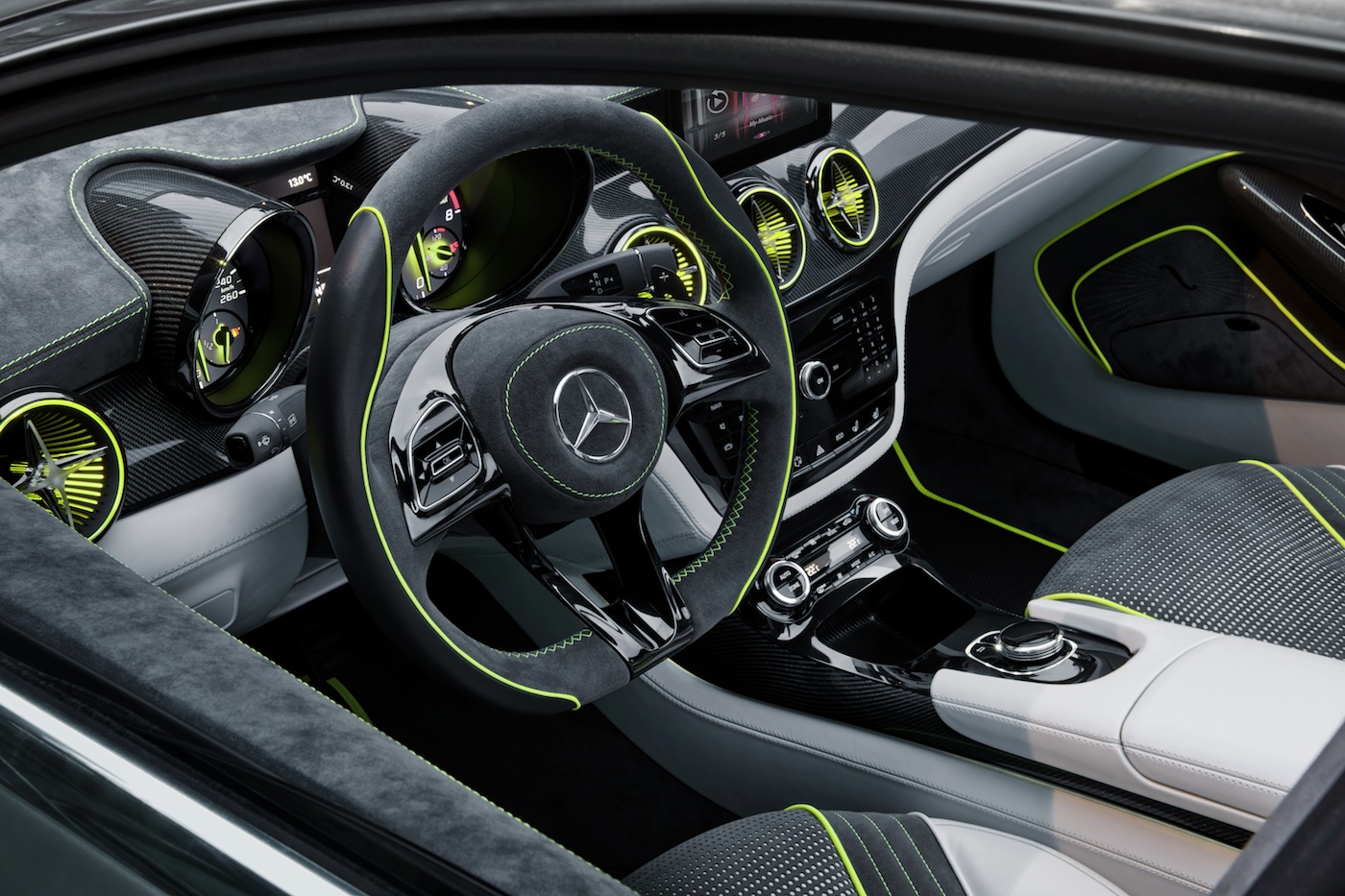 Inside there's lashings of carbon-fiber and leather, all edged in neon green pinstriping, with anthracite-coloured Alcantara rubbing supple shoulders with suede. Switchgear gets a black anodised finish, and while the seats have been recycled from the A-Class Sports model, they do get an illuminated, electroplated insert.