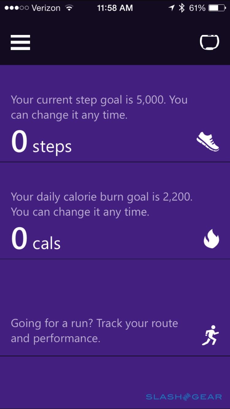 Tap the default screen, meanwhile, and you get to the fitness section. There's no doubting that health is Microsoft's particular focus with the Band – the companion app for Windows Phone, iOS, and Android is called "Microsoft Health" after all – and it's this screen that shows your pedometer count, calorific burn, miles traveled, and heart rate.