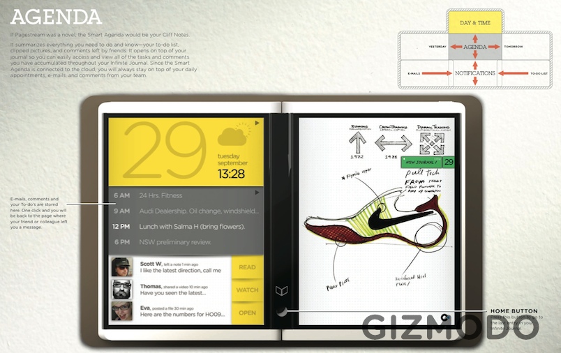 The core concept of the Courier is the Infinite Journal, and that's kept under control with the Smart Agenda that pulls out pertinent calendar entries, to-do lists, messages and indexed pages so that you're not left browsing the whole database mindlessly. Information is snapped from the browser or the external camera on the back, or via sketches or handwriting recognition, and can be "tucked" under the center spine as you find the right place to store it. That center spine also has a single Home button, similar to that on the iPhone.