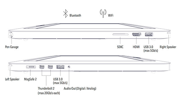 Ports include HDMI, two Thunderbolt 2, an SDXC slot, and two USB 3.0 sockets – just as on the regular notebook – while inside there's Bluetooth and WiFi.