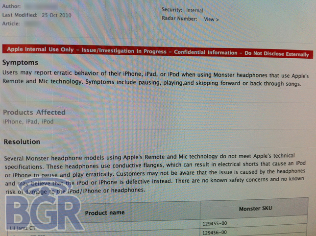 An unnamed source has come forward to express that the Cupertino-based company does know that there's an issue with Monster-branded headphones, and Apple's mobile devices: the iPad, iPod line-up, and iPhone. Apple has confirmed that several Monster headphones are causing "erratic behavior," which includes random skips forward and back in songs, as well as randomly pausing and playing tracks.