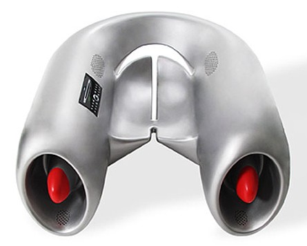 Audio is provided by an integrated CD/MP3 player, with speakers hidden in the arms of the "Morfojet" chair. According to the designer-speak description, the chair "alludes to some aerodynamic shapes" and prepares us for "a ghostly journey through the world of music and video."