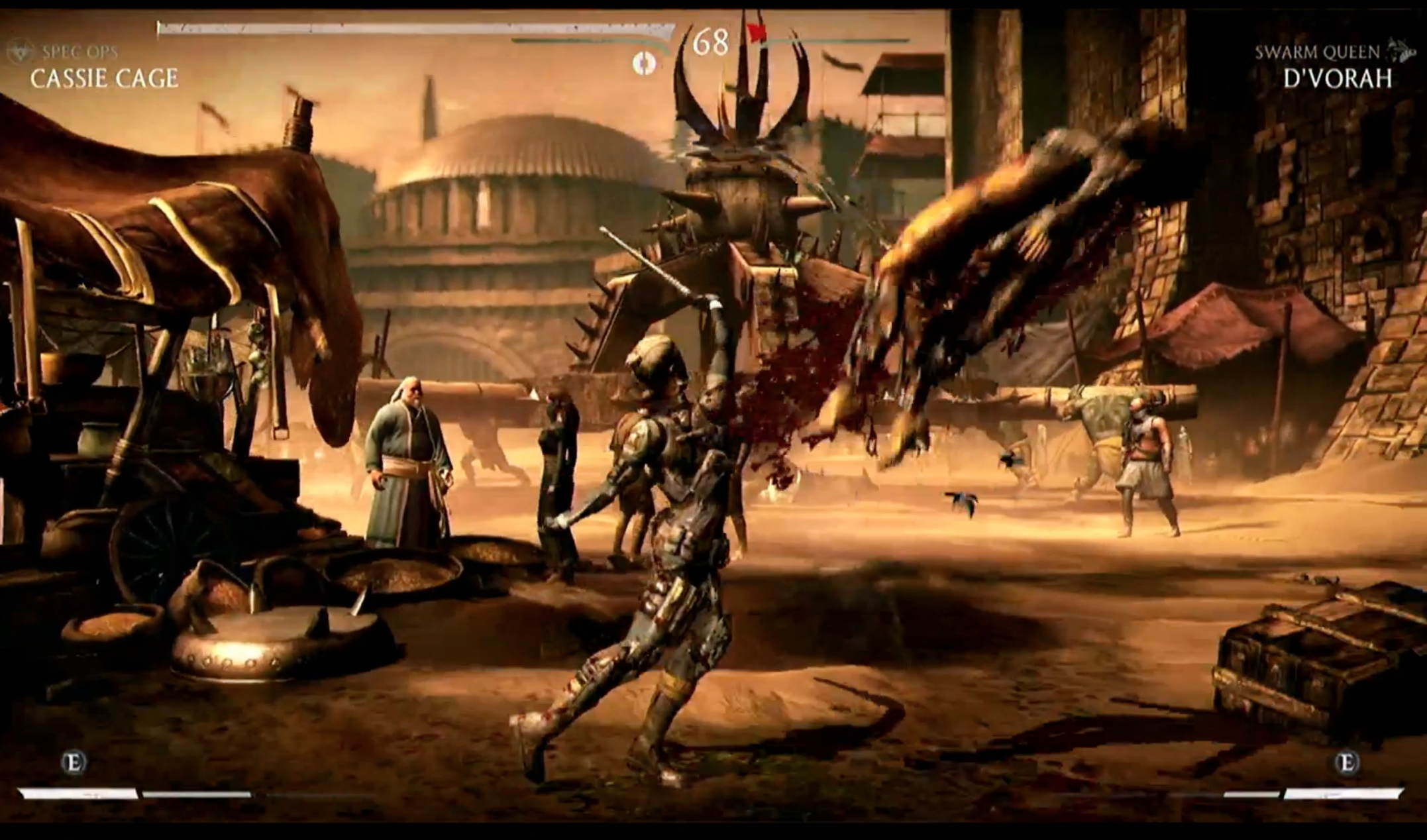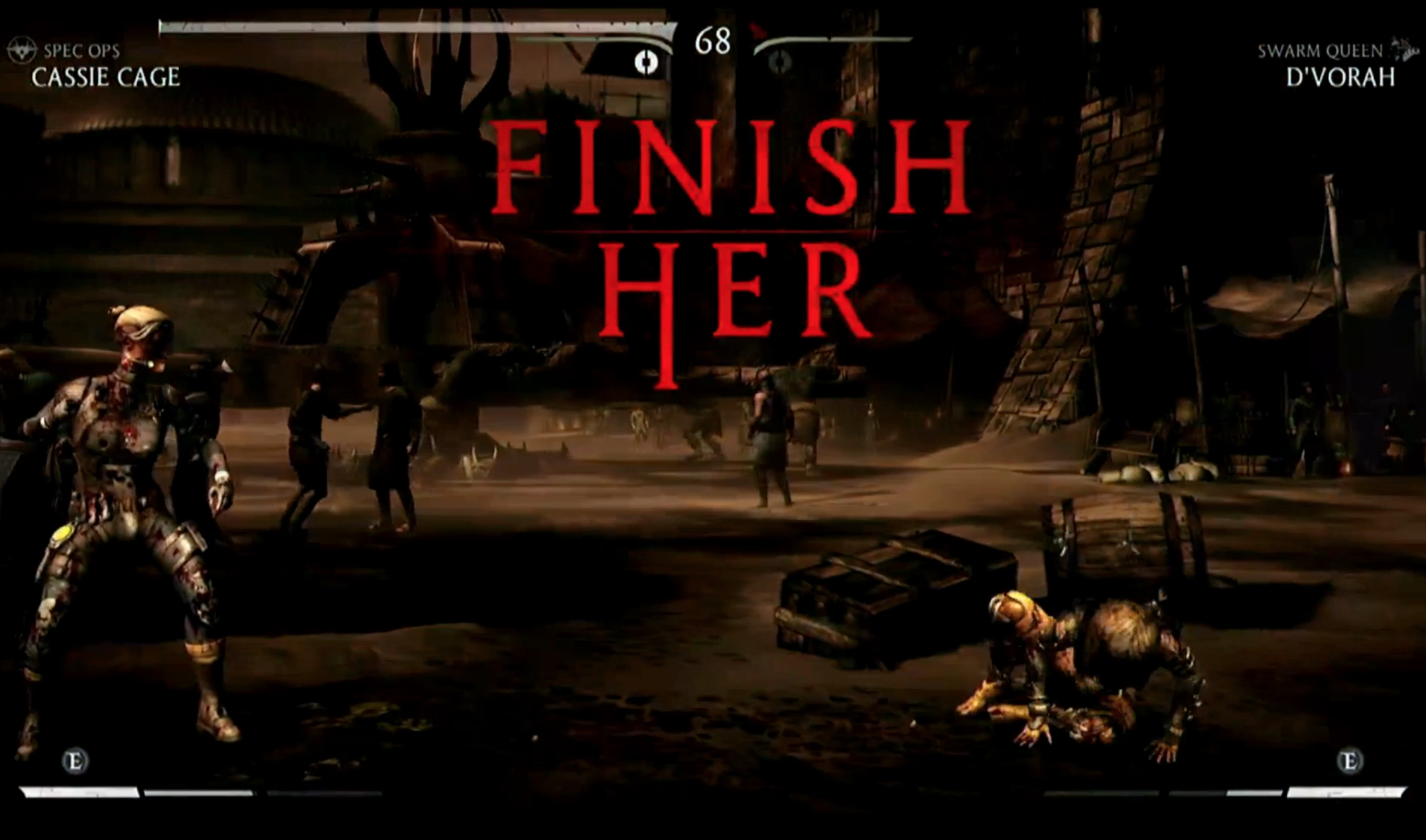 D'Vorah also appears in this match with a "Swarm Queen" style. She's got bug moves that appear to serve her well – including a stinger through the back of the head in through the mouth – until the end. The end of this match comes up with Cassie Cage bringing a Sonya-style fatality which uses bubblegum to great effect.