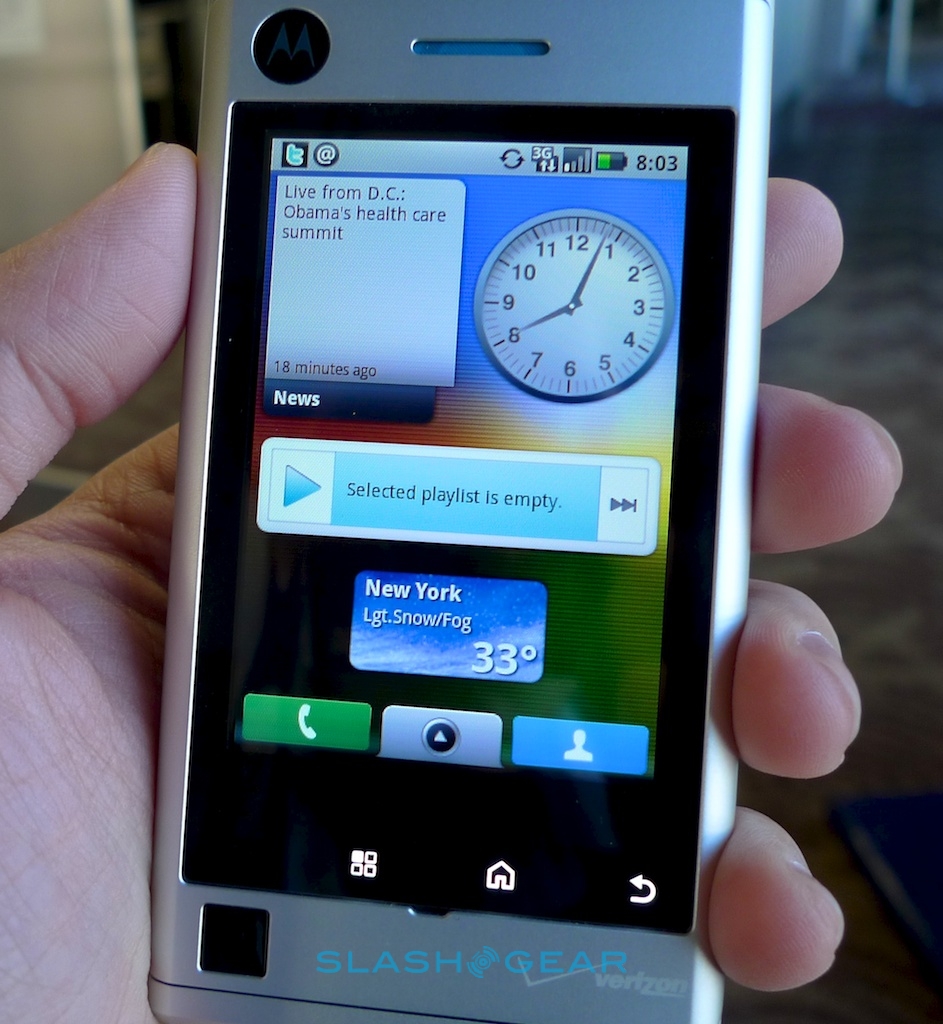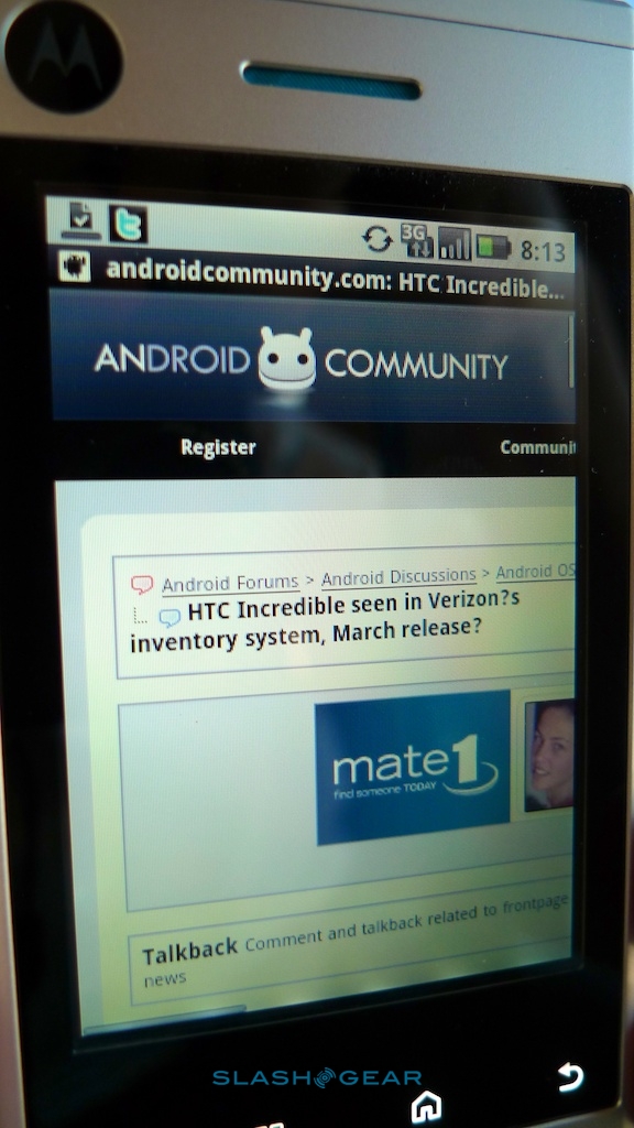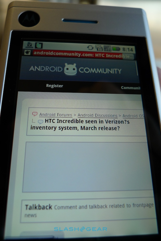 Where the experience begins to pale is once you turn the DEVOUR on. Build quality may be on a par with the DROID but the hardware is definitely more budget minded. The 3.1-inch display runs at HVGA (320 x 480) resolution (compared to the DROID's 3.7-inch 480 x 854 panel) and while the capacitive touch layer is as responsive as we've come to expect from the technology, we miss the extra pixels. The DEVOUR is a MOTOBLUR device, which means ready integration with various social networks, but the payoff is being limited to an older version of Android. Motorola are yet to rework MOTOBLUR to suit Android 2.1, the current release, and so the DEVOUR is stuck with Android 1.6.